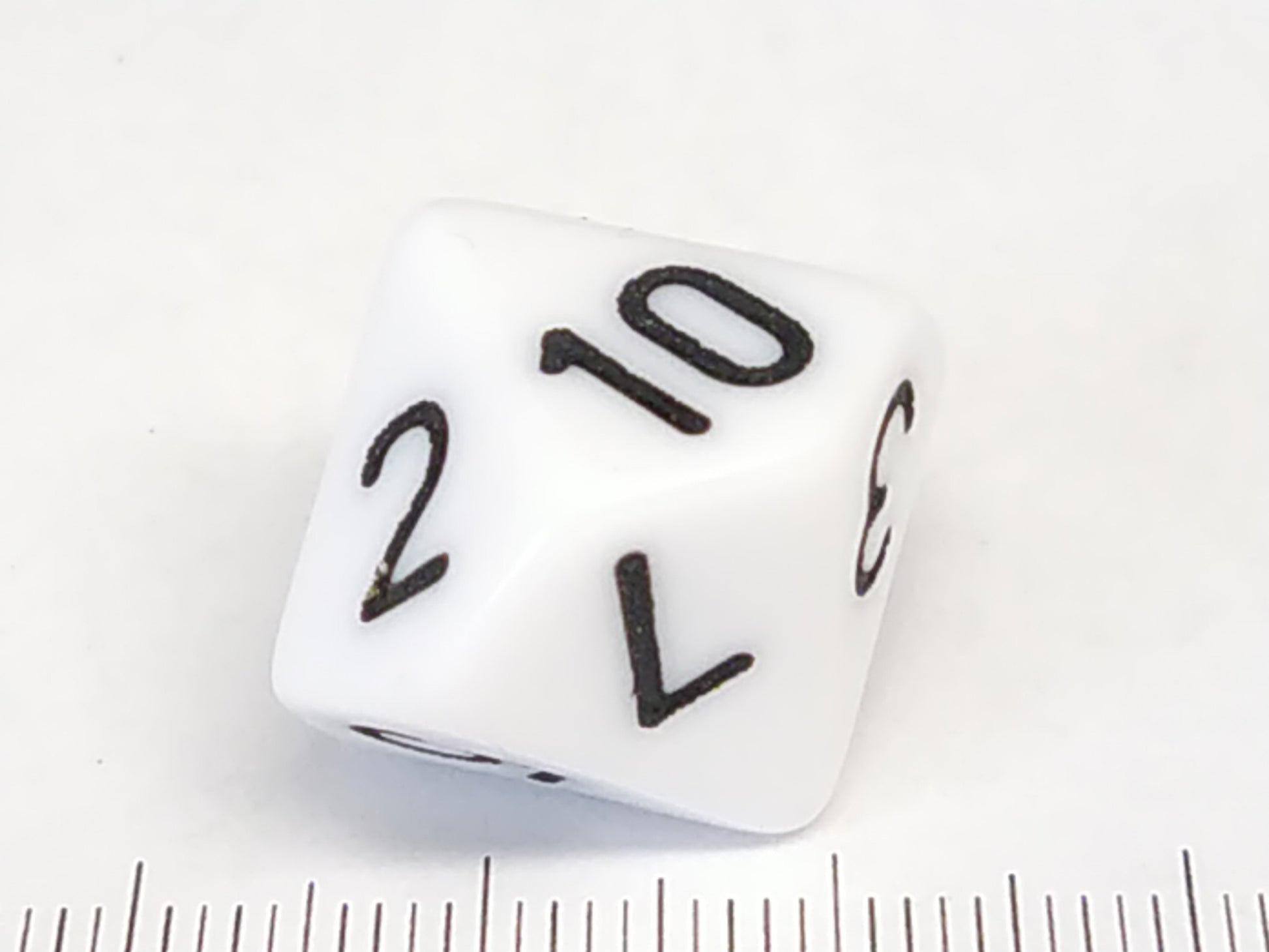 A ten-sided die. Unlike most ten-sided dice, this one has the numbers 1 to 10 instead of 0 to 9.