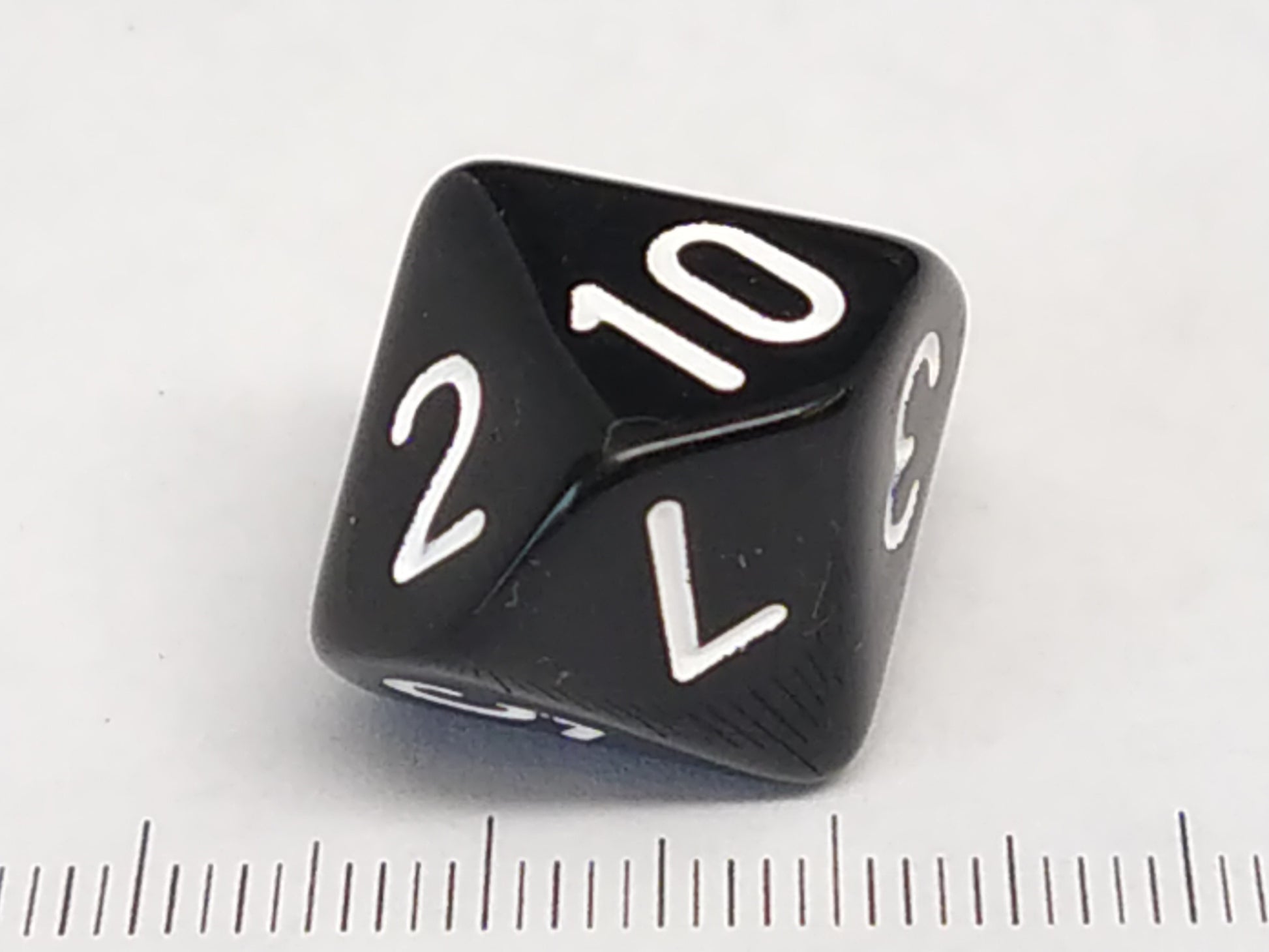 A ten-sided die. Unlike most ten-sided dice, this one has the numbers 1 to 10 instead of 0 to 9.