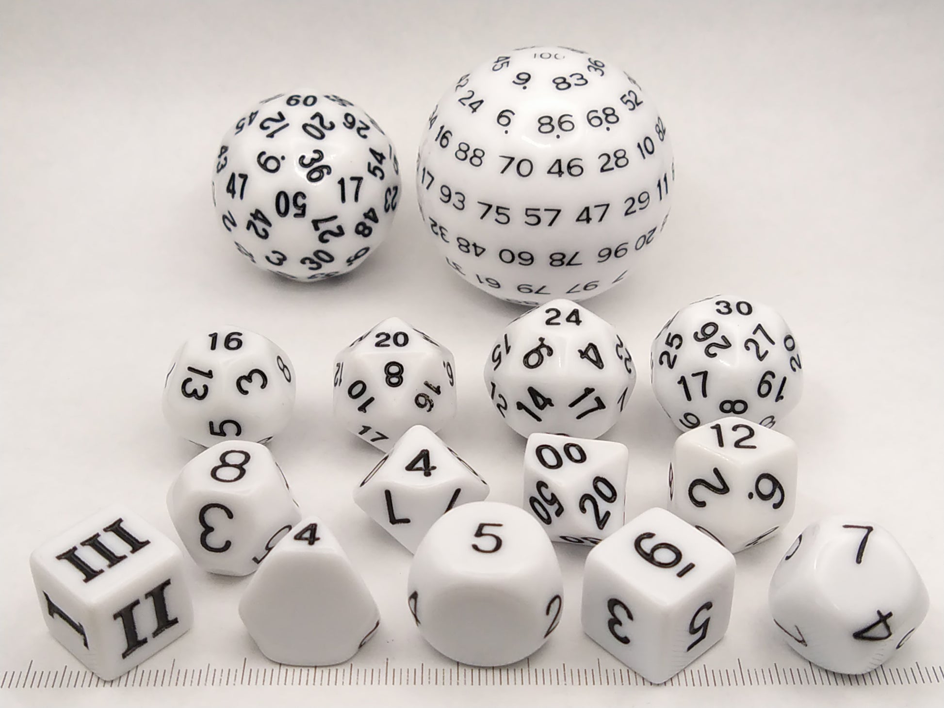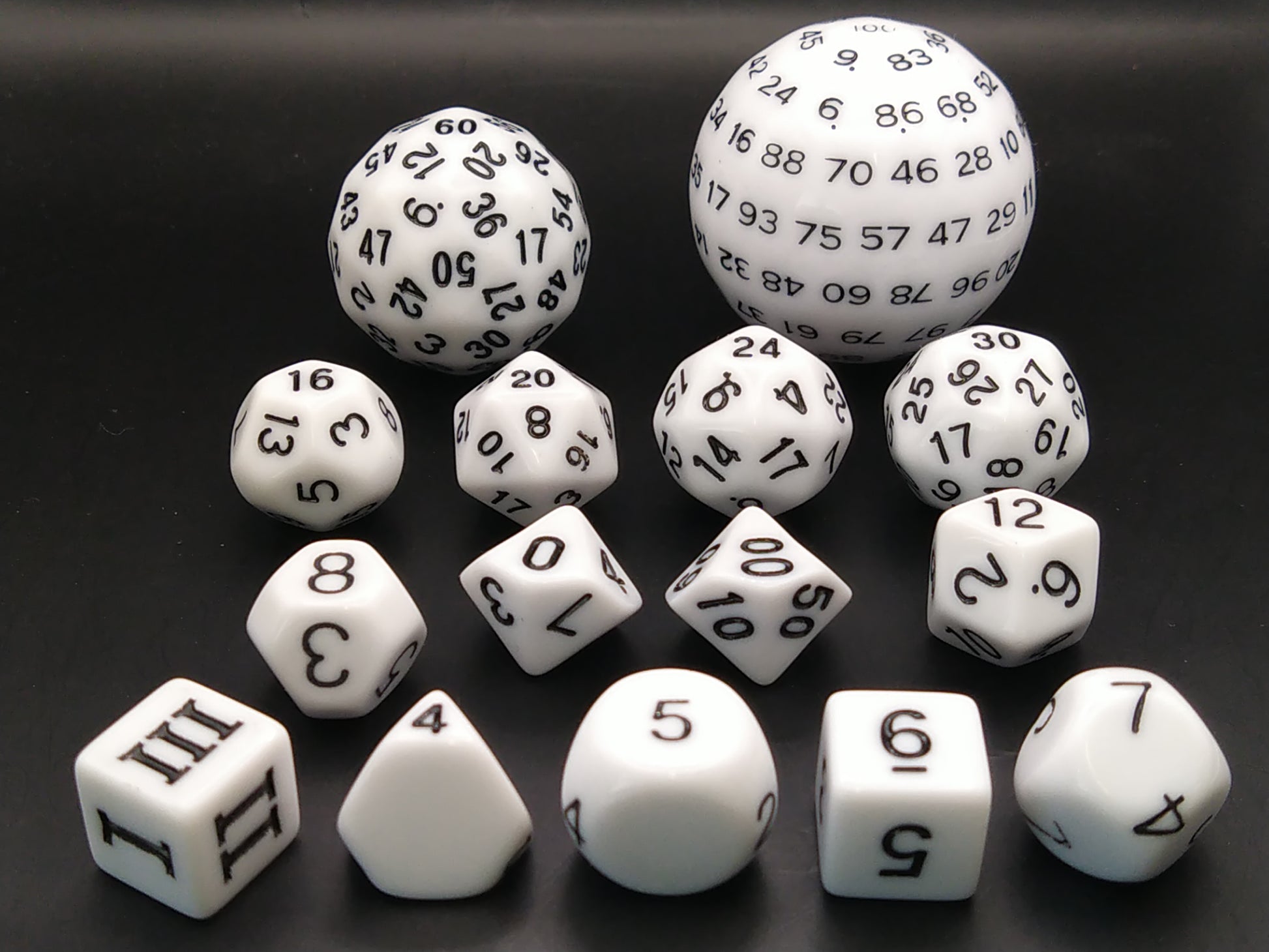 Een 15 delige dobbelsteen set met bijzondere dobbelstenen in wit met zwarte cijfers.