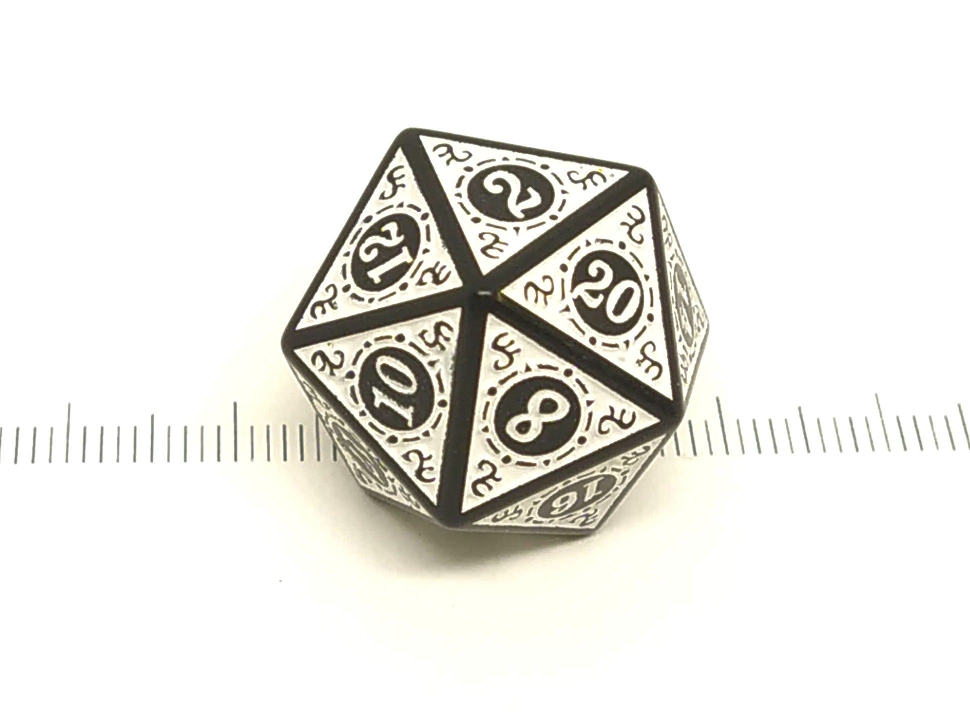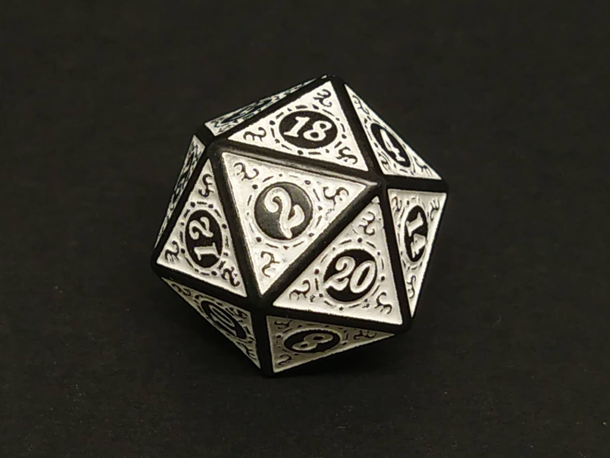 Een 20-zijdige zwarte dobbelsteen met witte in relief gedecoreerde vlakken.