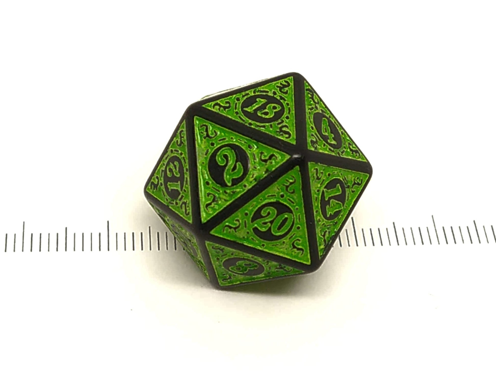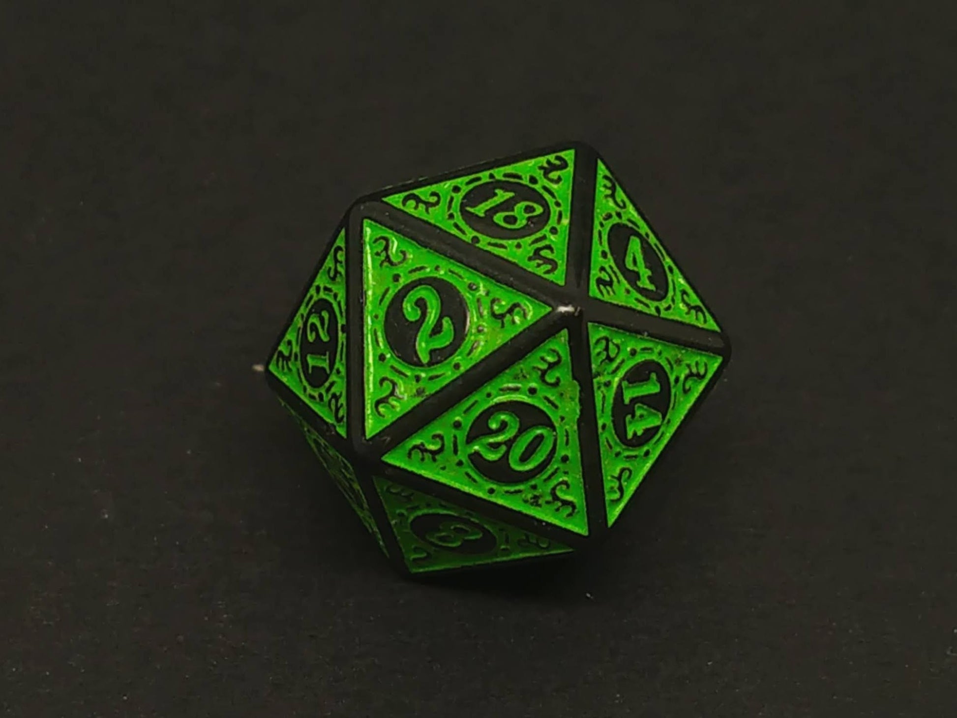 Een 20-zijdige zwarte dobbelsteen met groene in relief gedecoreerde vlakken.