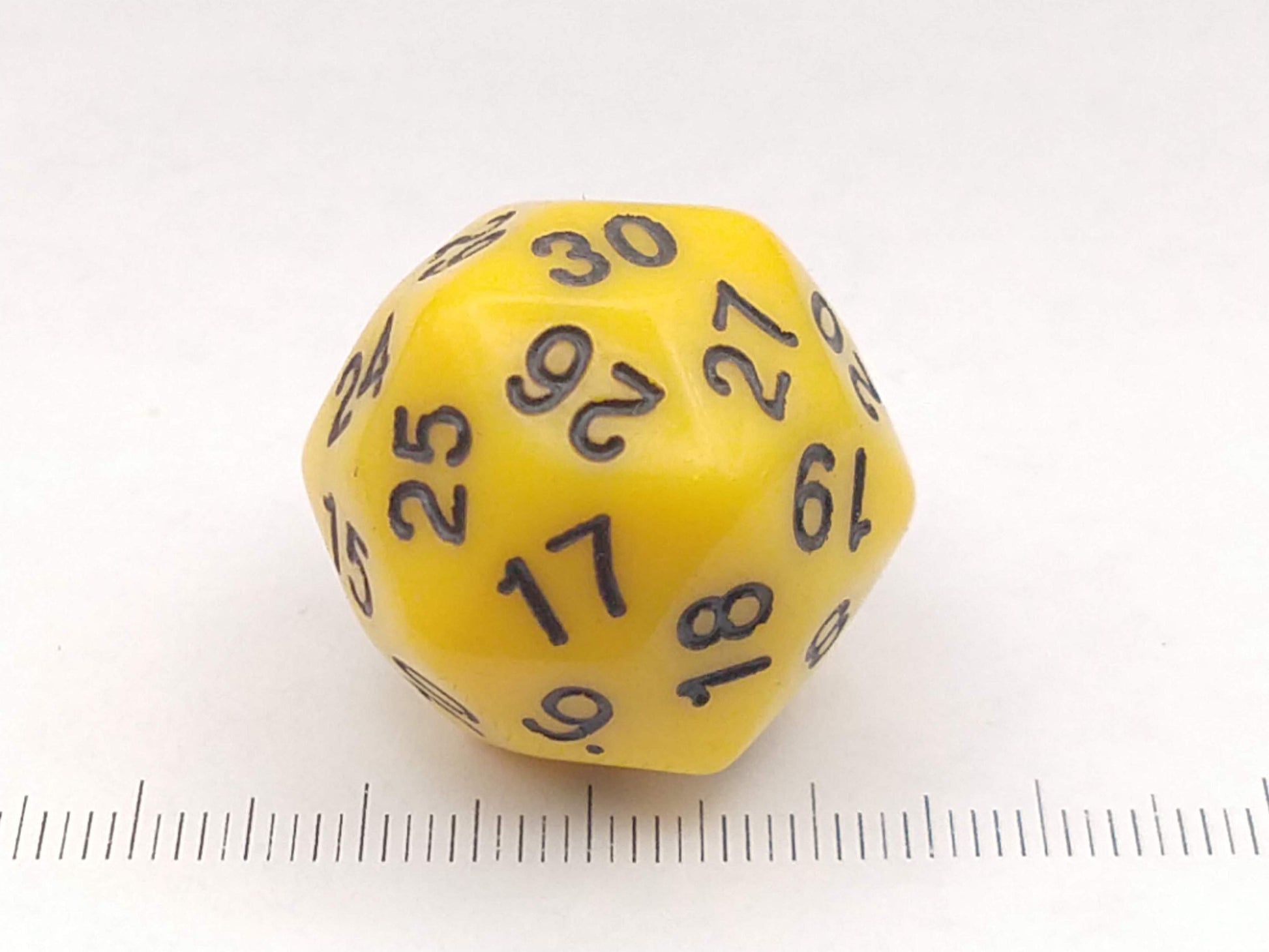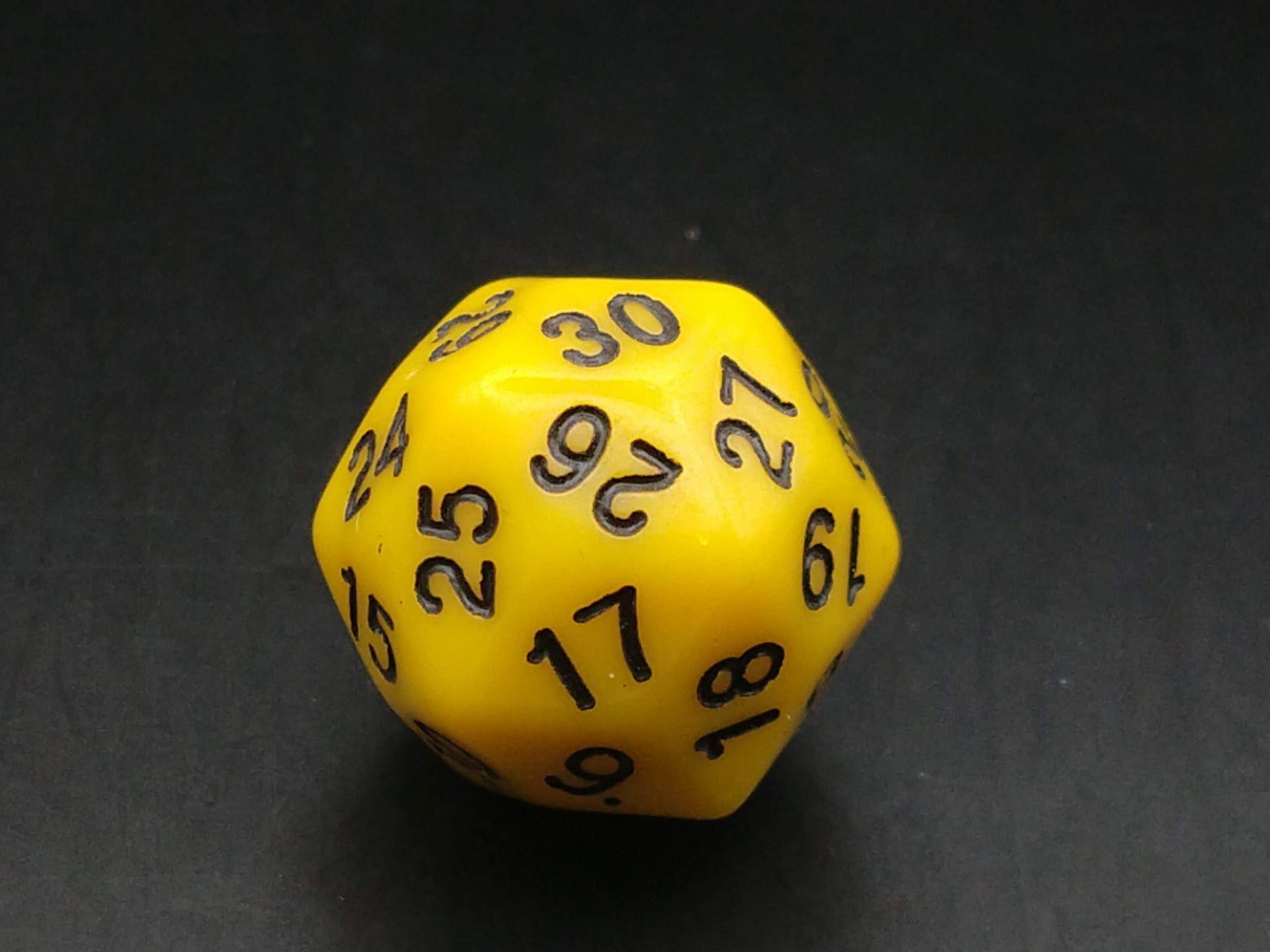 A 30-sided yellow die with black numbers, 31mm.