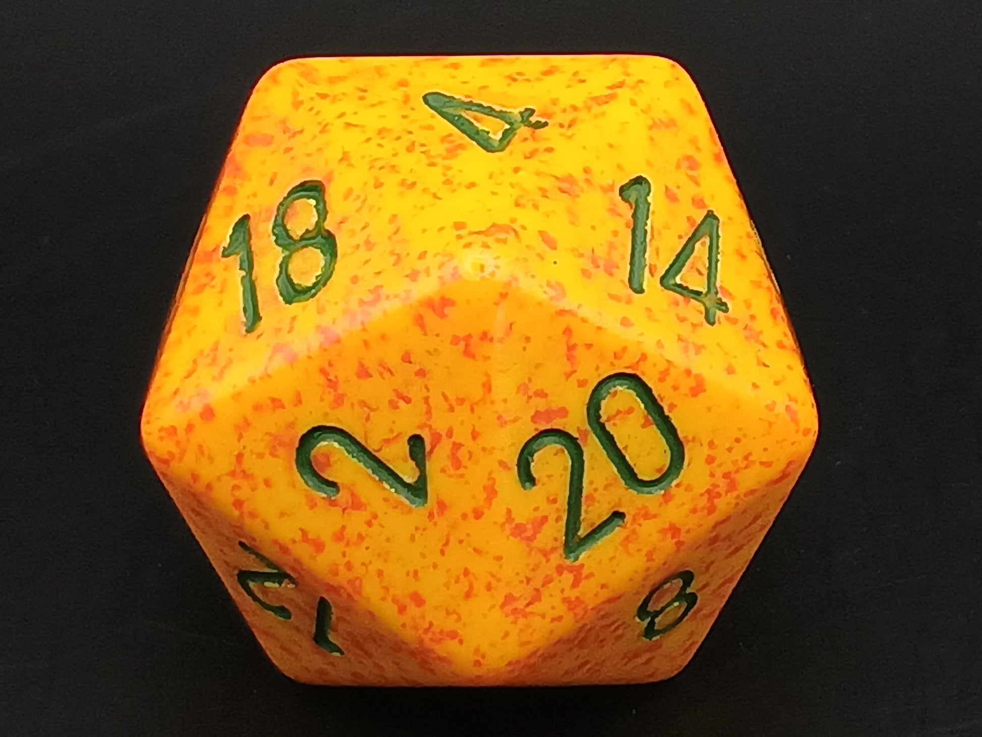 A large 20-sided Chessex die, speckled yellow with green numbers.
