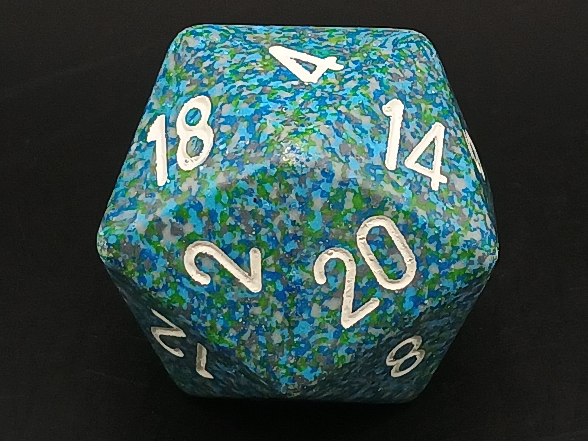 A large 20-sided Chessex die, speckled teal with white numbers.