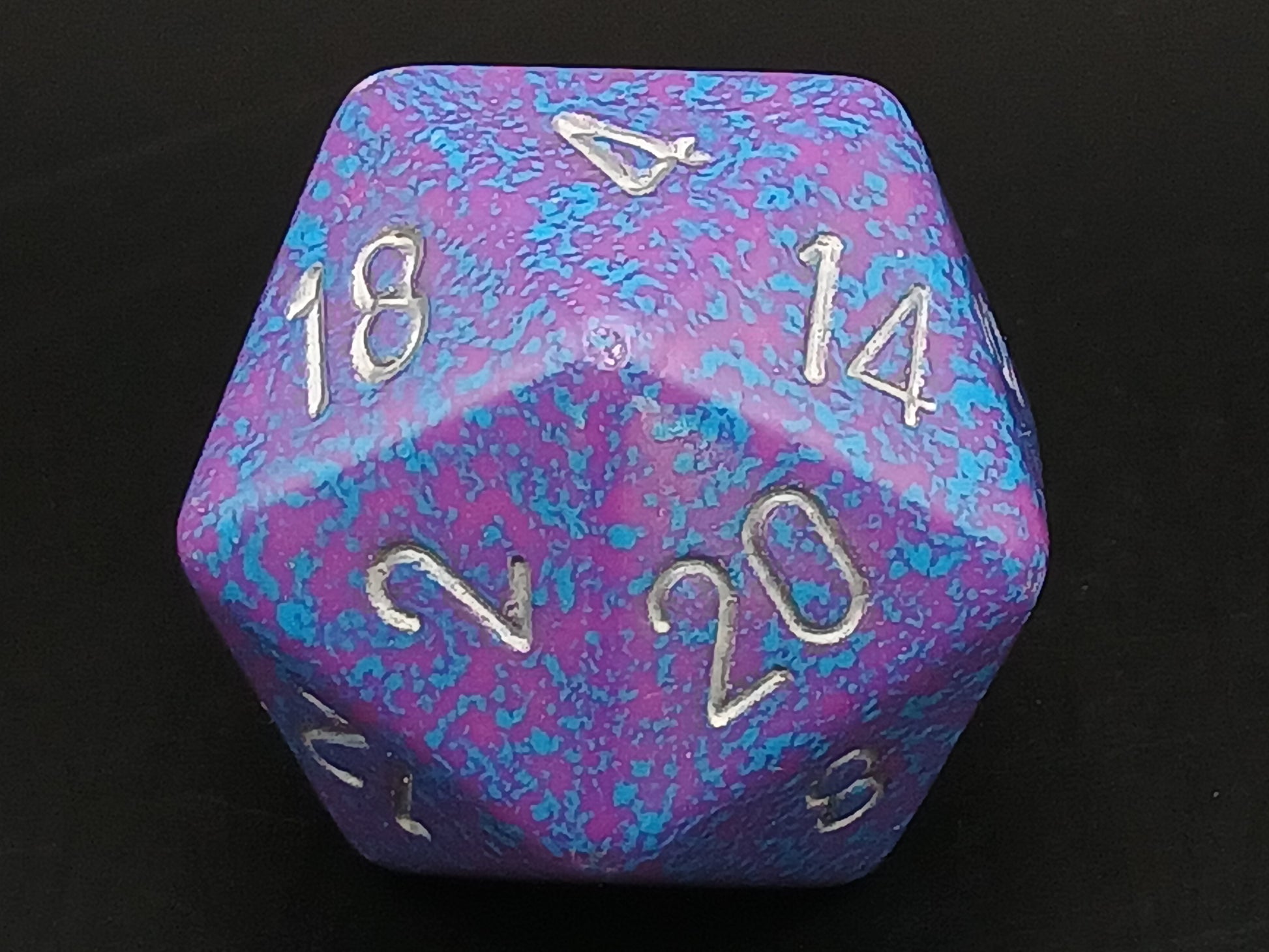 A large 20-sided Chessex die, speckled purple-blue with silver numbers.