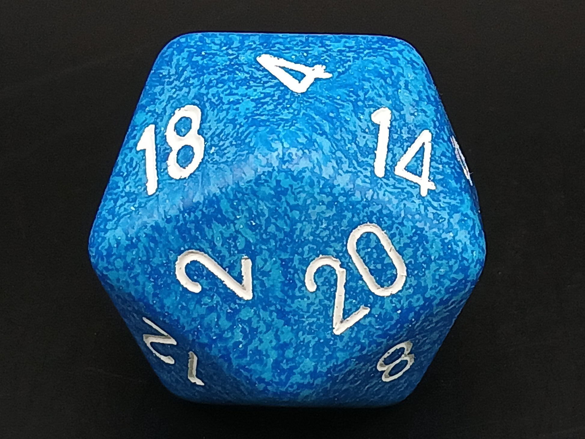 A large 20-sided Chessex die, speckled blue with white numbers.