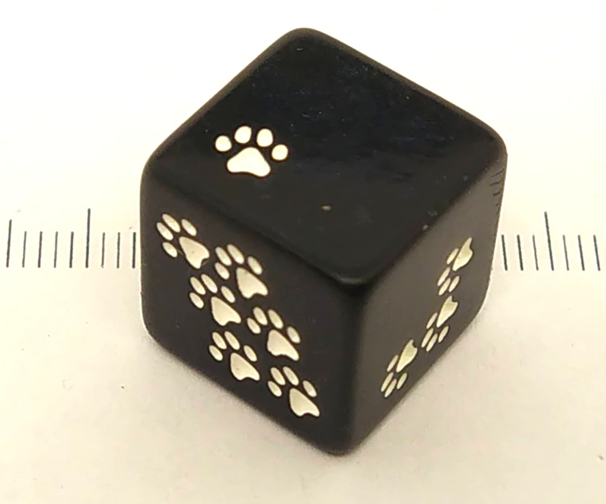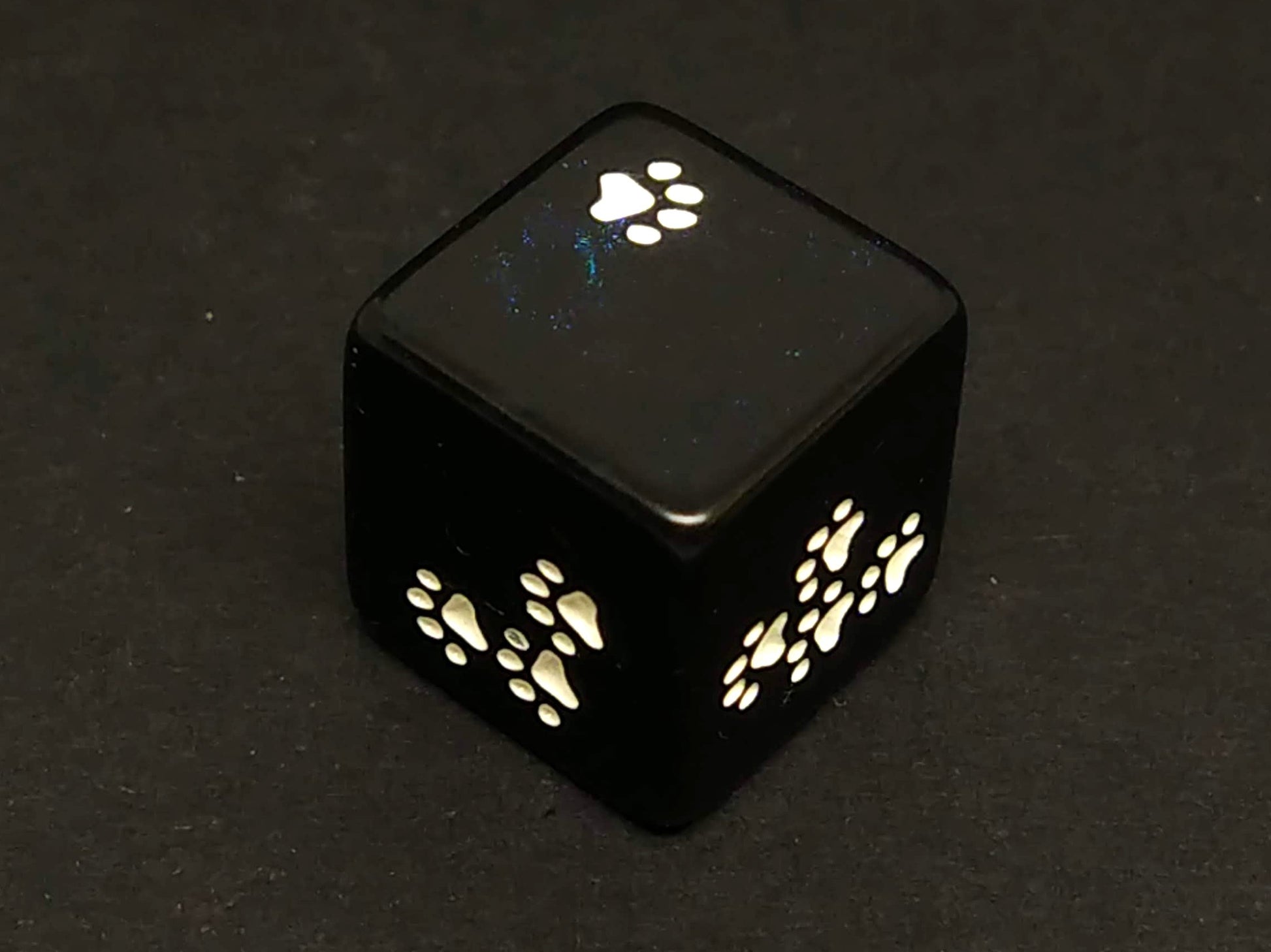 A black 6-sided dice with a hint of blue glitter and white cat paws instead of dots.