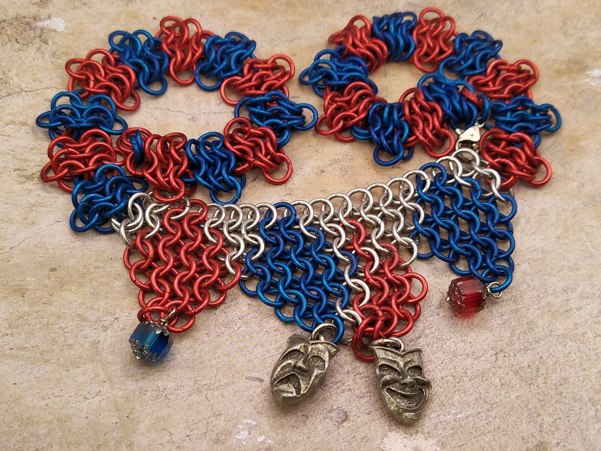 Een ketting gemaakt van aluminium ringen in zilver, rood en blauw. Dit stuk heeft twee dubbelzijdige armbanden die komedie en drama uitbeelden, zeer bekende theatermaskers die teruggaan tot 500 voor Christus.