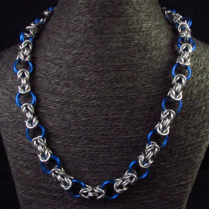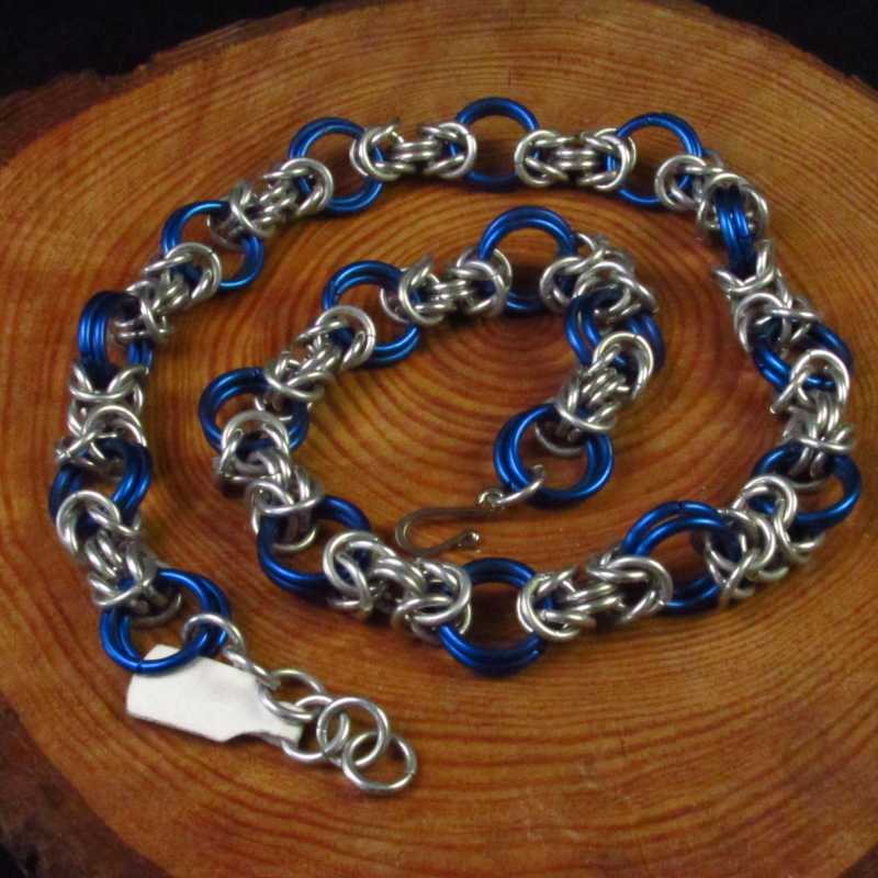 Een aluminium ketting gemaakt met blauwe en zilverkleurige ringen in een Byzantijns weefsel, de totale lengte is 52,5 cm.