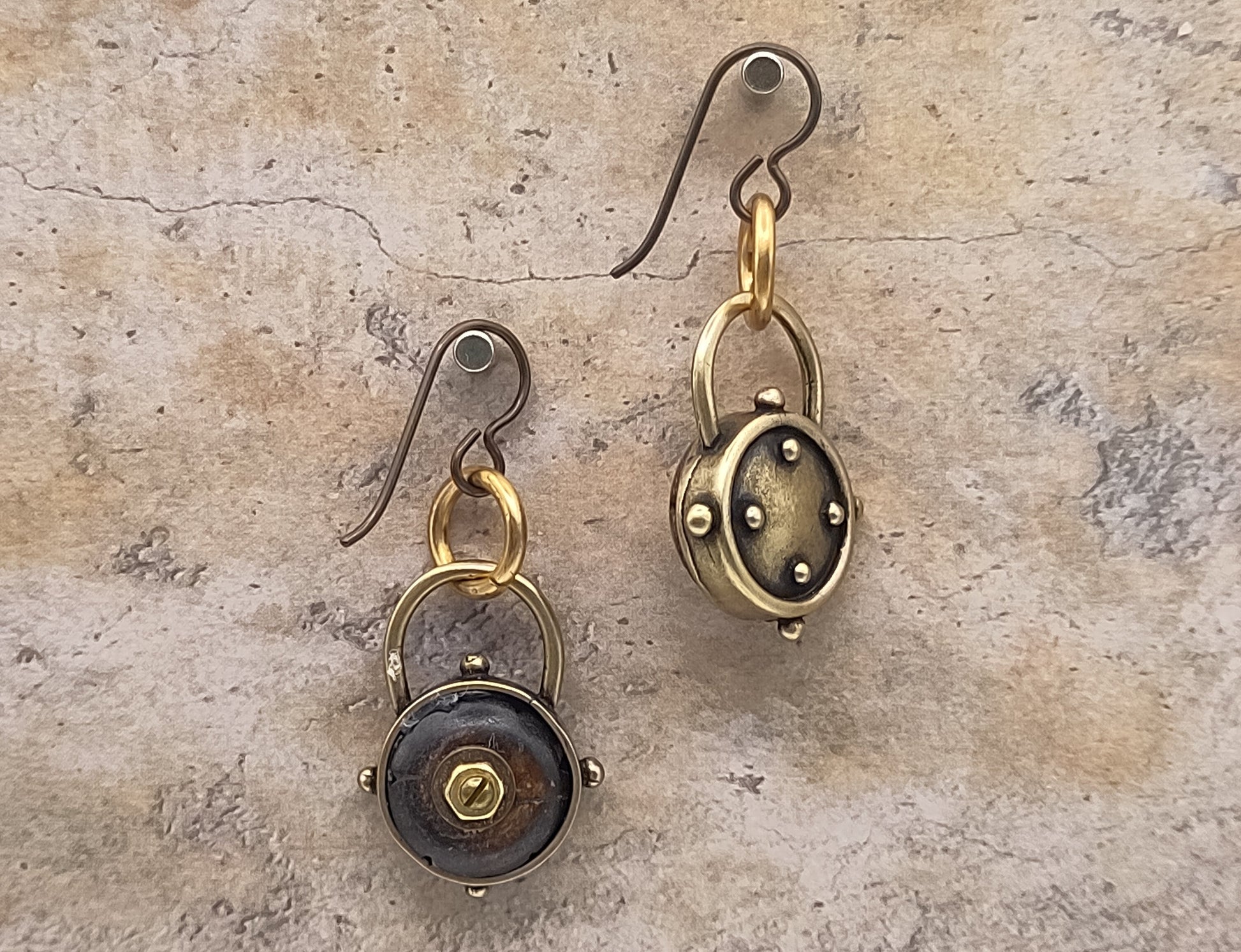 Een set Niobium oorbelhaakjes met daaraan een bedel die ons doet denken aan een hele oude duikklok. Vandaar de naam Bathysphere.