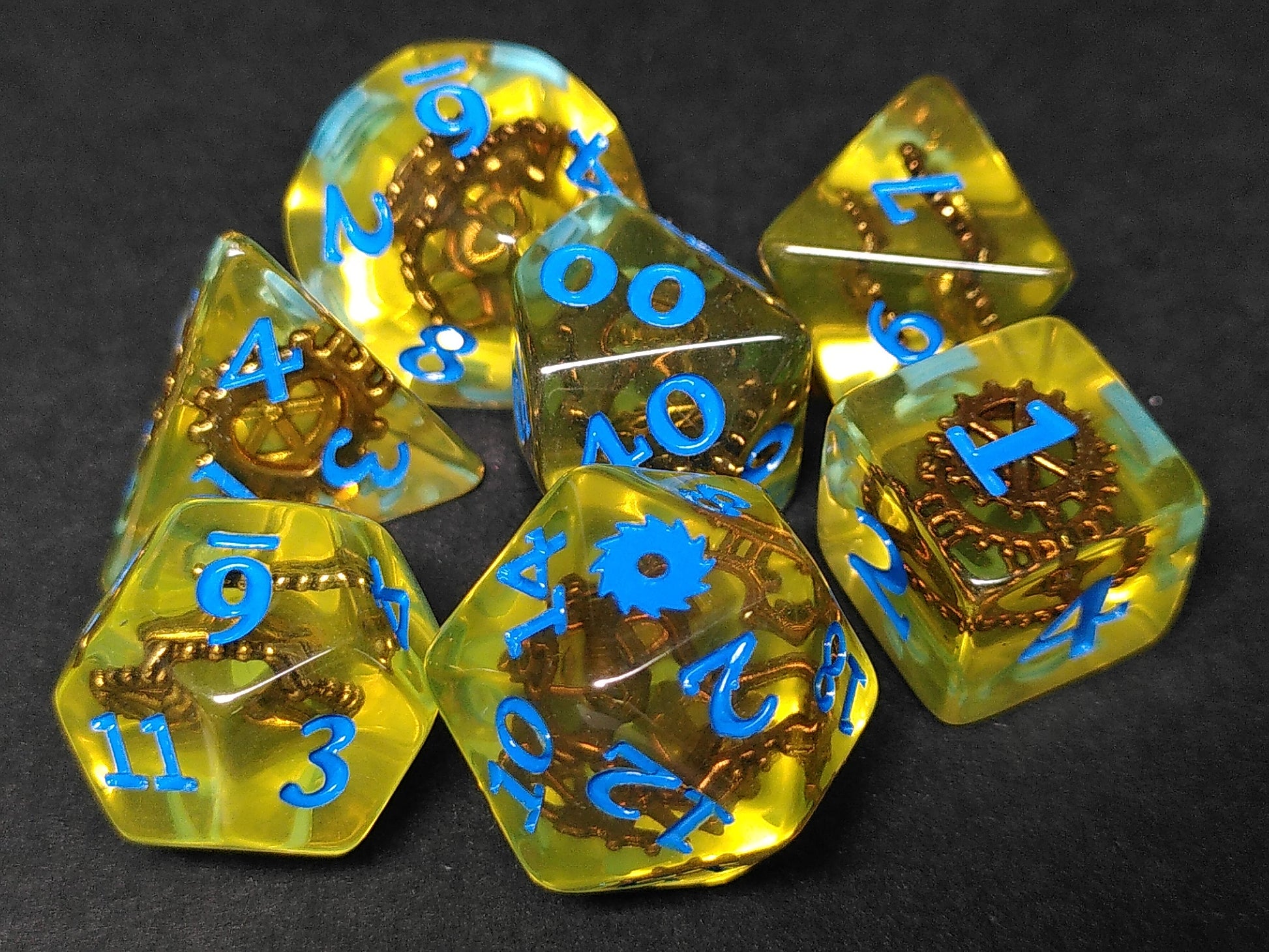 Add some sparkle to your roll with this beautifully polished dice set, inspired by your favorite automaton. The Fresh Cut Grass dice set is translucent yellow, featuring embossed blue metallic numbering, small bronze gears on each die, and a saw icon on the 20 side of the d20 die.