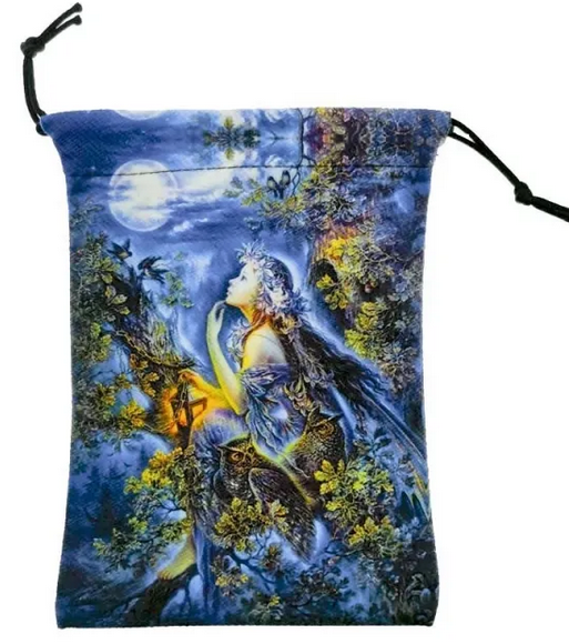 A black and soft velvet pouch. This pouch is colorfully printed on both sides with a fairy in a tree looking up at the moon.