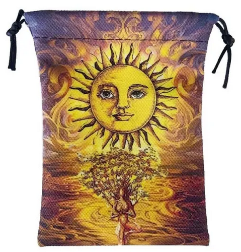 A black and soft velvet pouch. This pouch is colorfully printed on both sides with a gold-yellow colored sun shining on a desert-like area. A dryad-like figure stands under the sun.