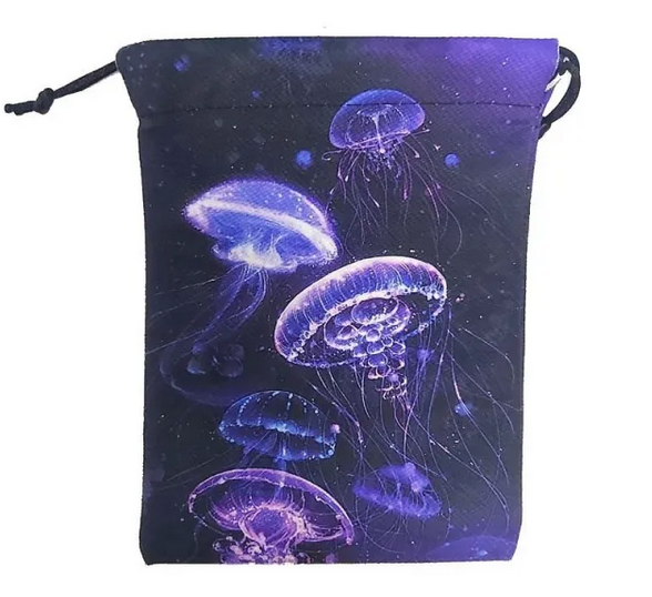 A soft velvet pouch, colorfully printed on both sides with a blue sea with jellyfish in it.