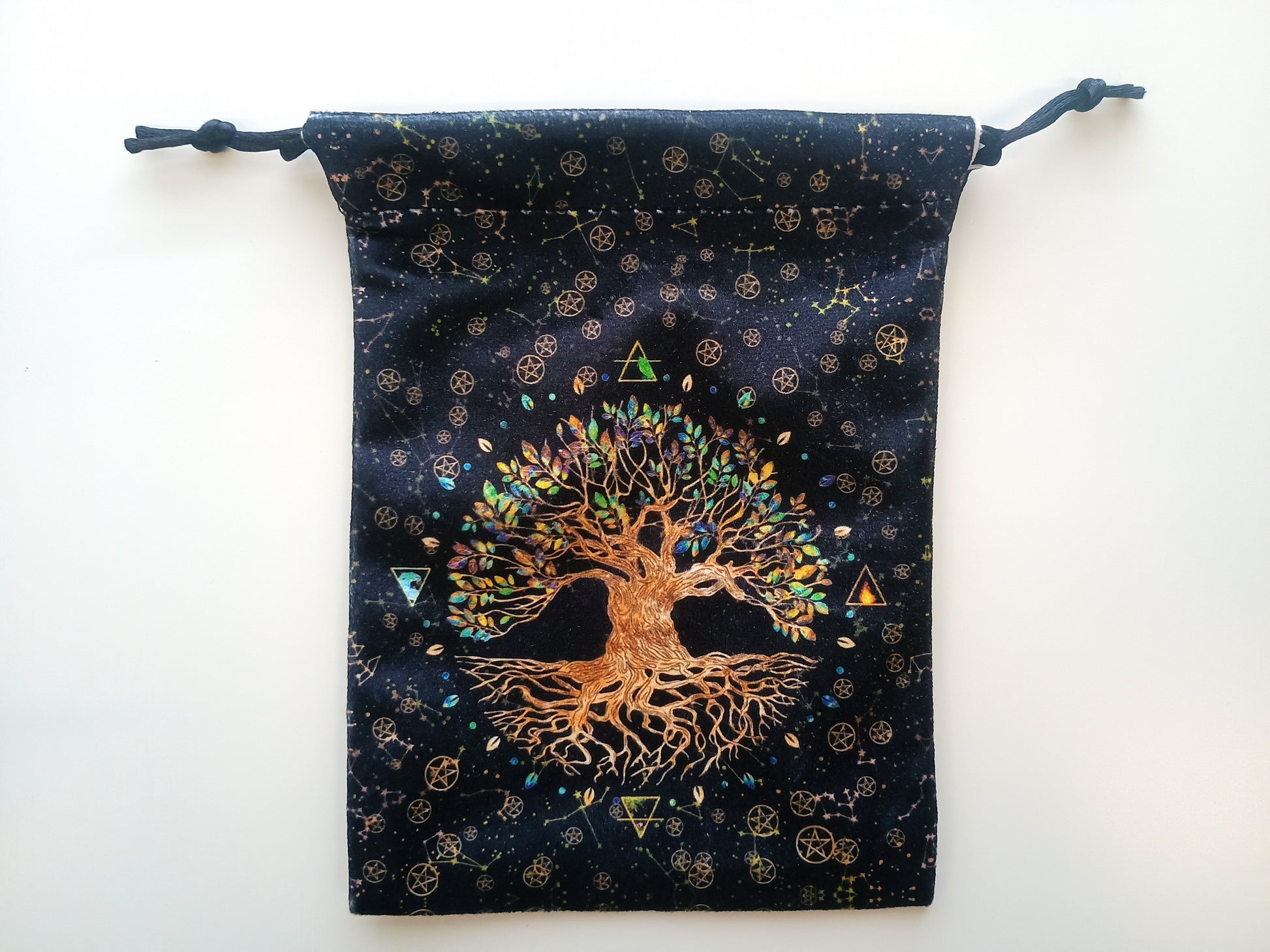 A black fabric pouch. This pouch is colorfully printed on both sides with a tree surrounded by the symbols of the four elements.