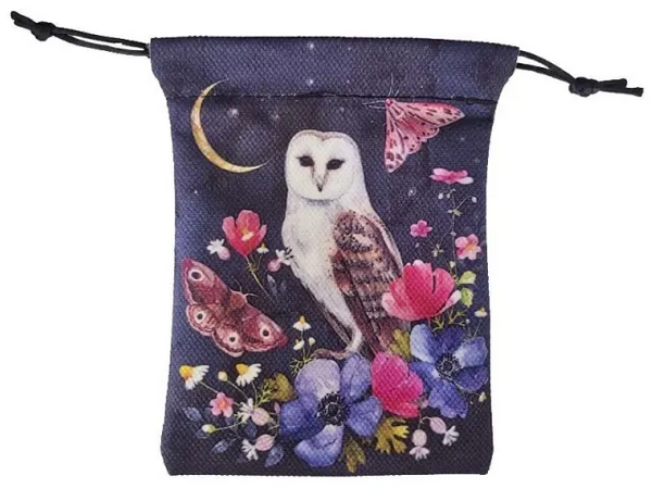 A soft velvet pouch, colorfully printed on both sides with a field of flowers, containing a barn owl and two moths.