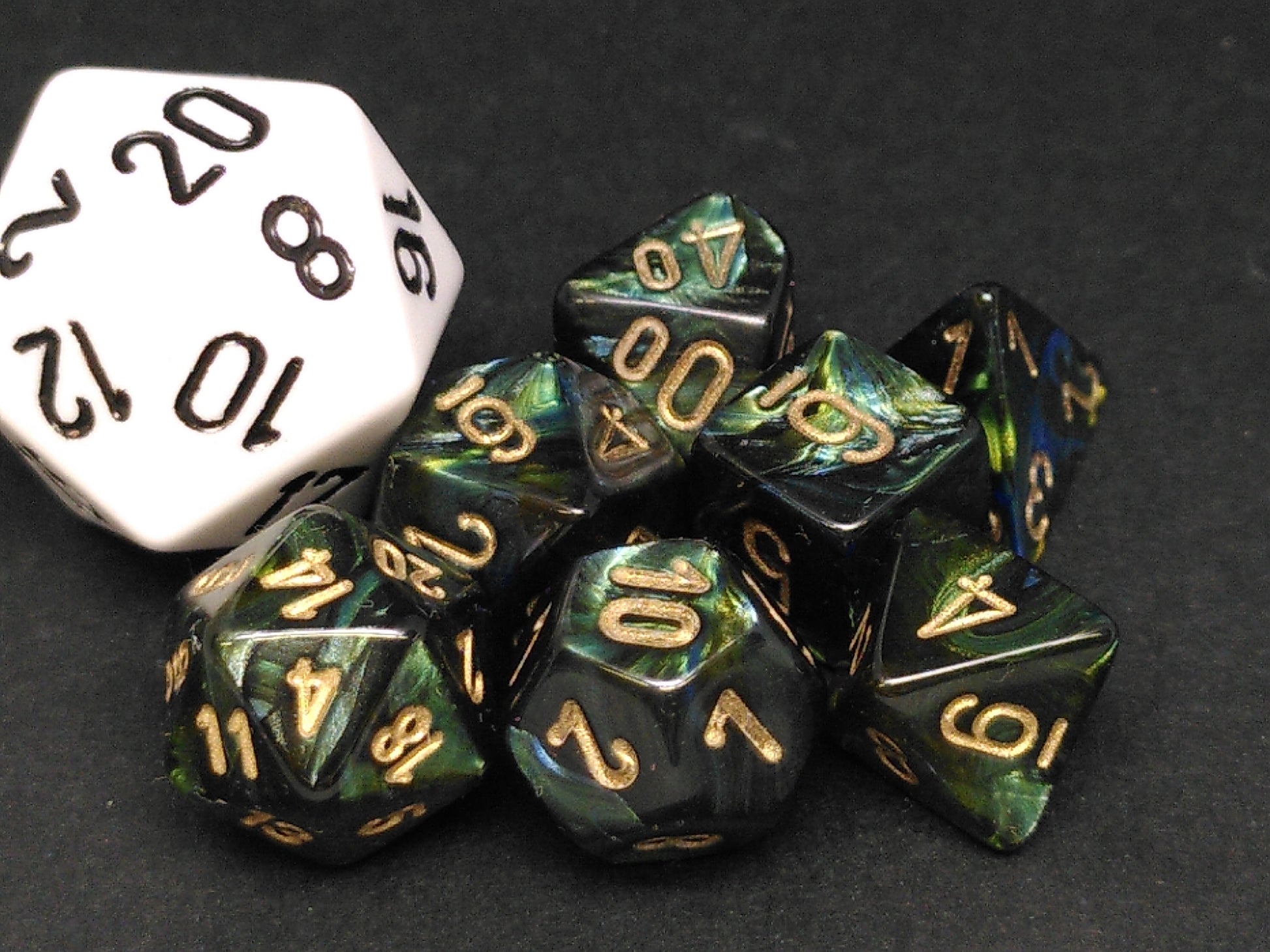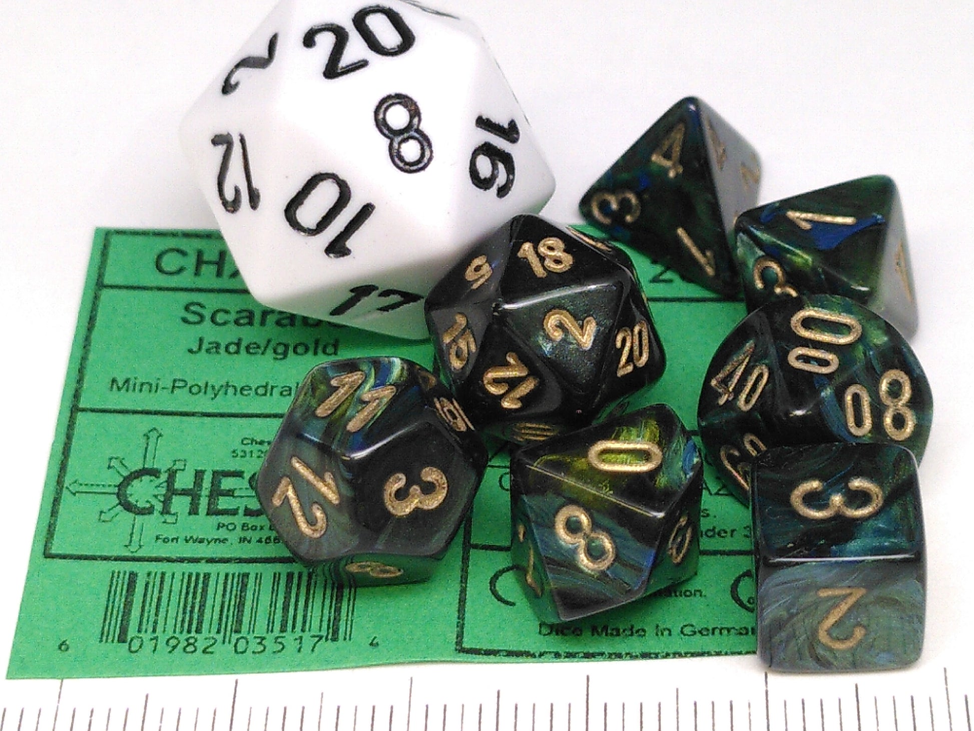 A set of seven mini chessex dice, glossy marbled green with gold-colored print.