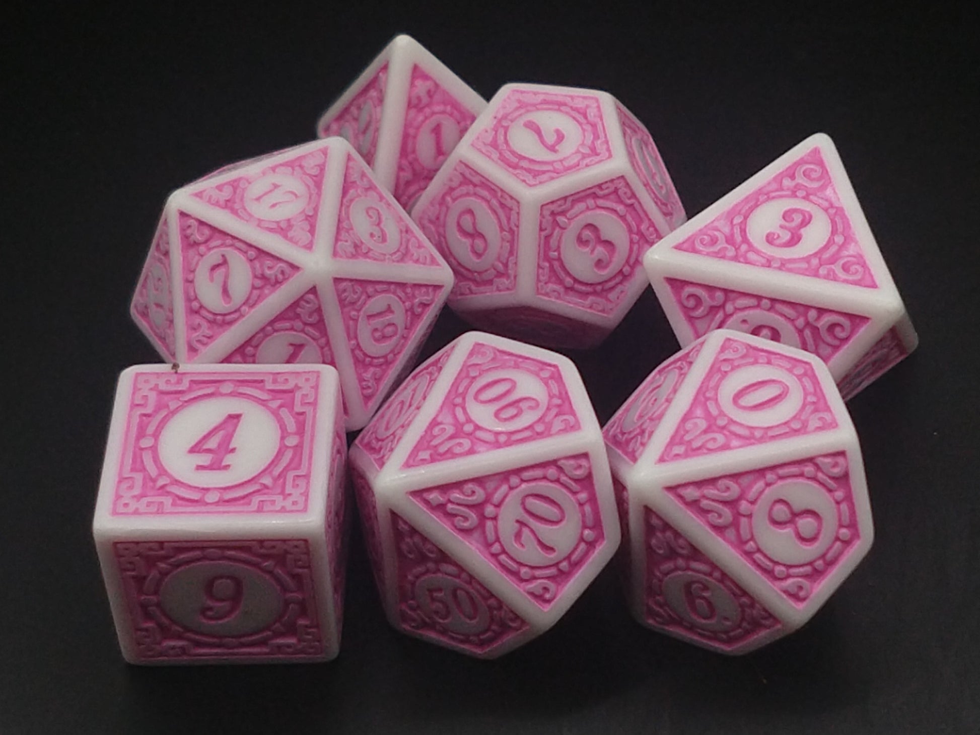 A set of white dice with relief filled with pink.