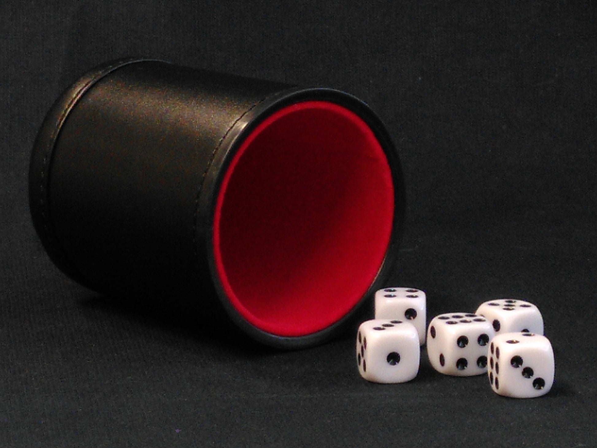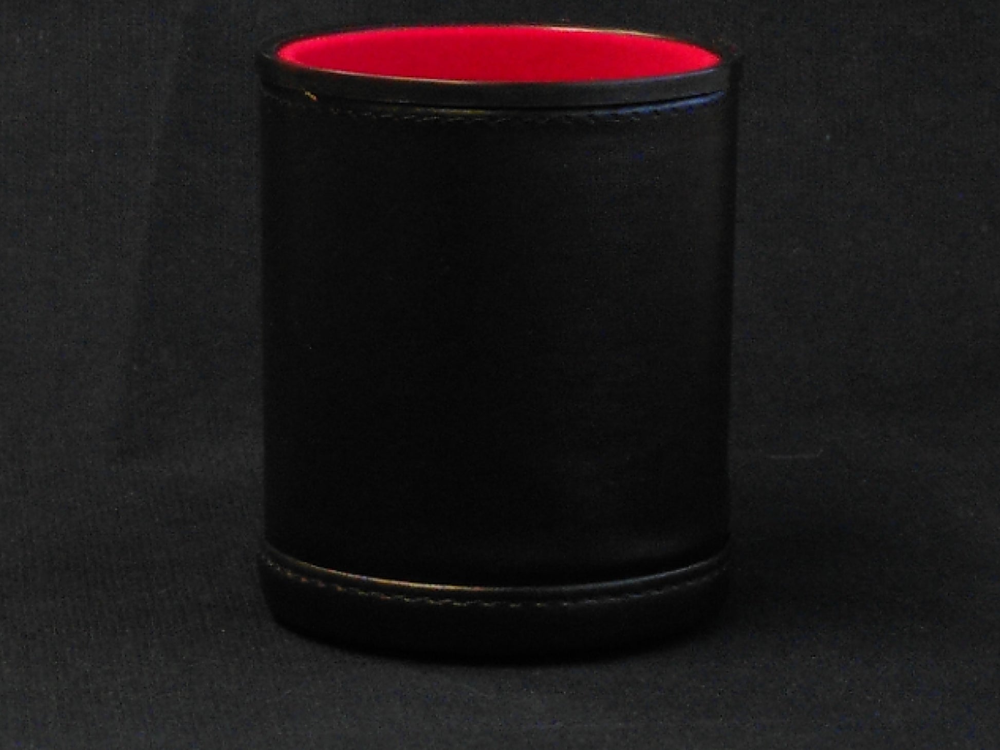 A PU synthetic leather dice cup lined with red flocked fabric.