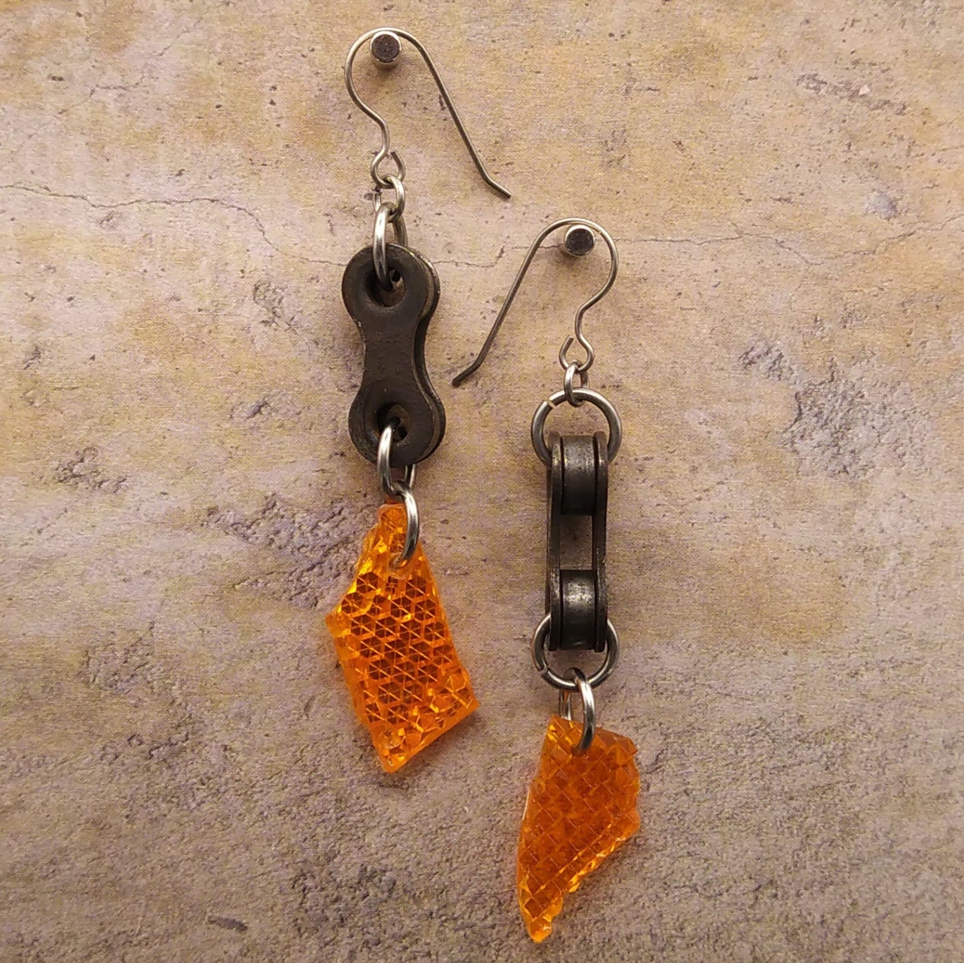 Een set titanium oorbelhaken met daar aan twee schakels uit een fietsketting, een twee stukken refelctor. De stukken reflector zijn ruw van structuur maar niet scherp.