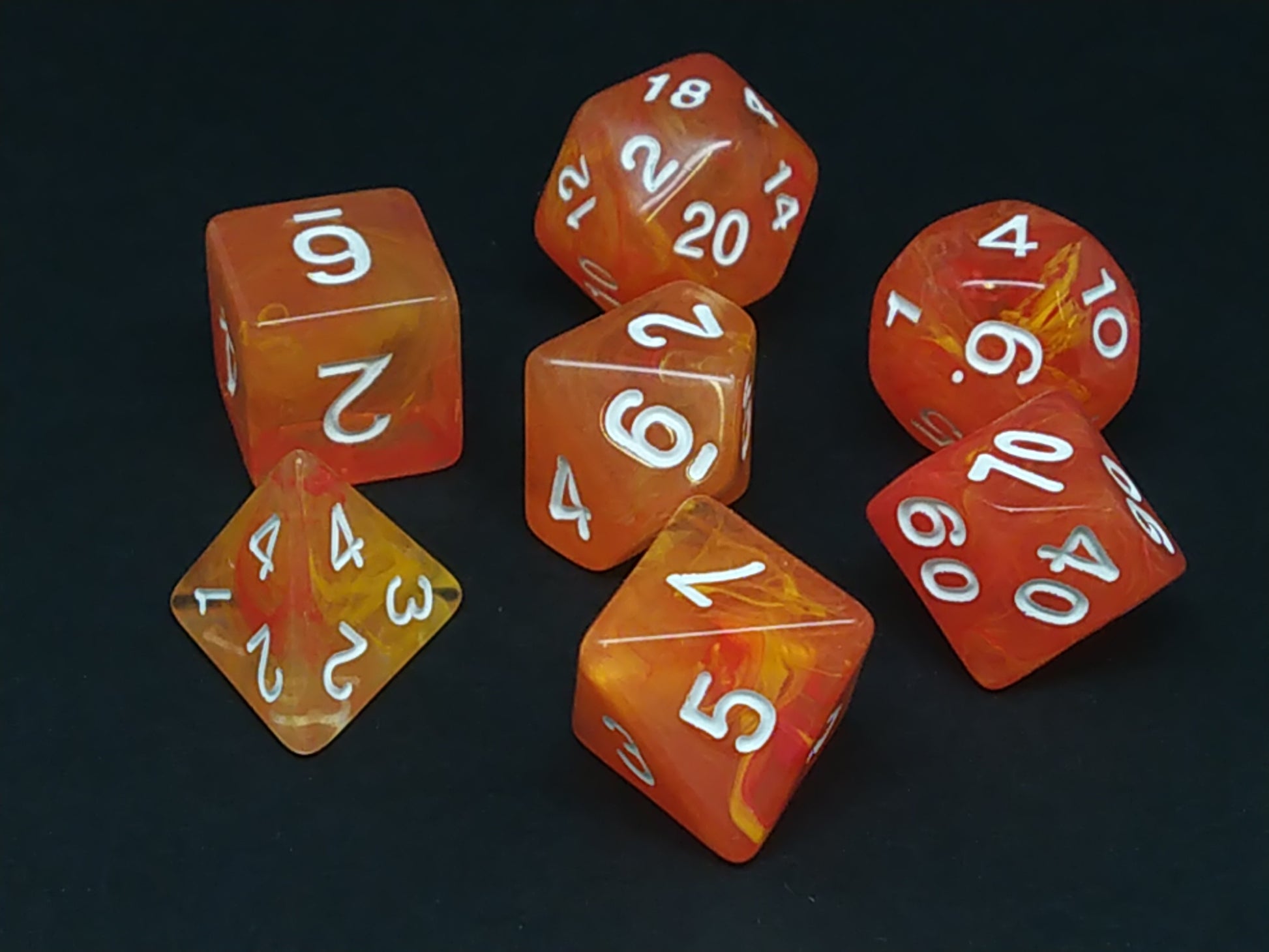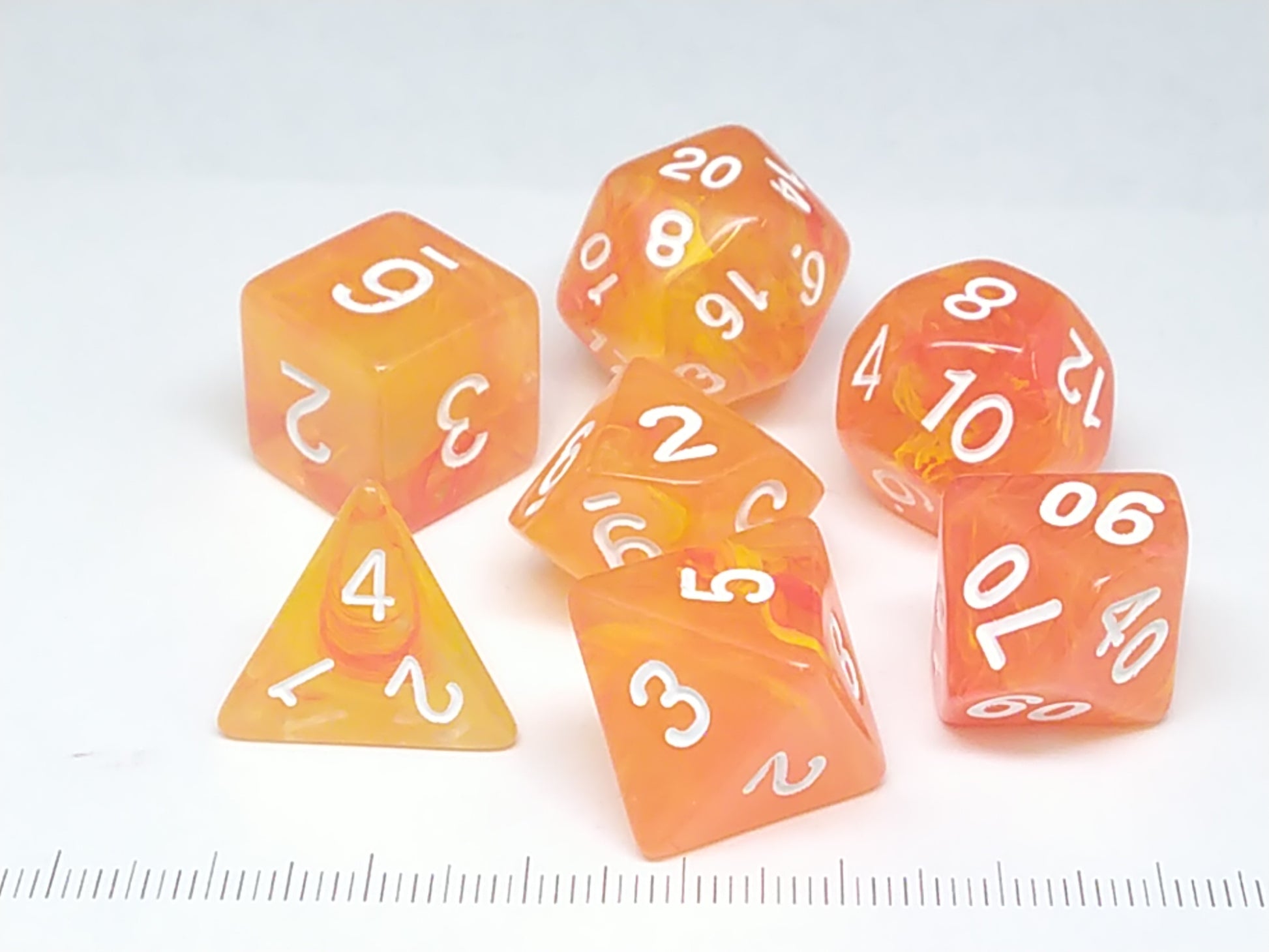 A set of semi-transparent polydice with orange/yellow clouds, this set has white numbers.