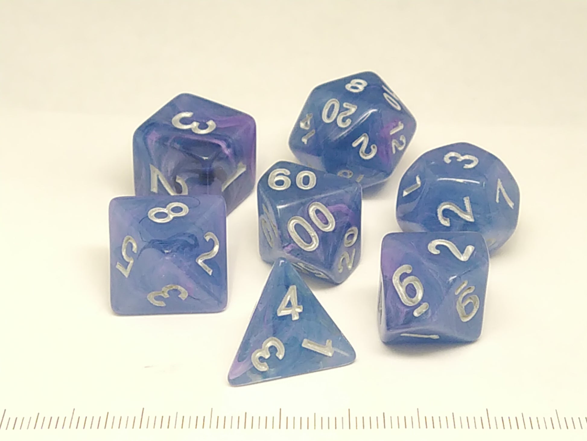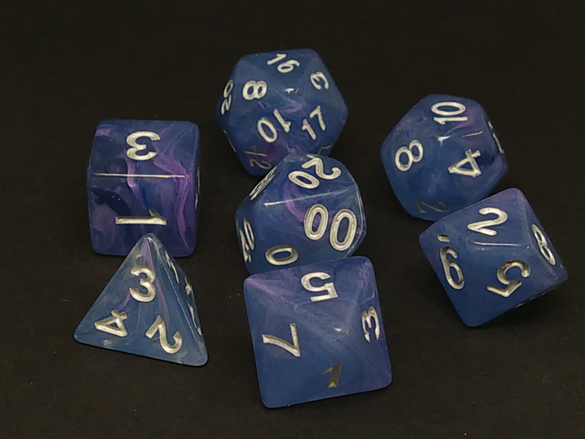 A set of semi-transparent polydice with blue/purple clouds, this set has white numbers.