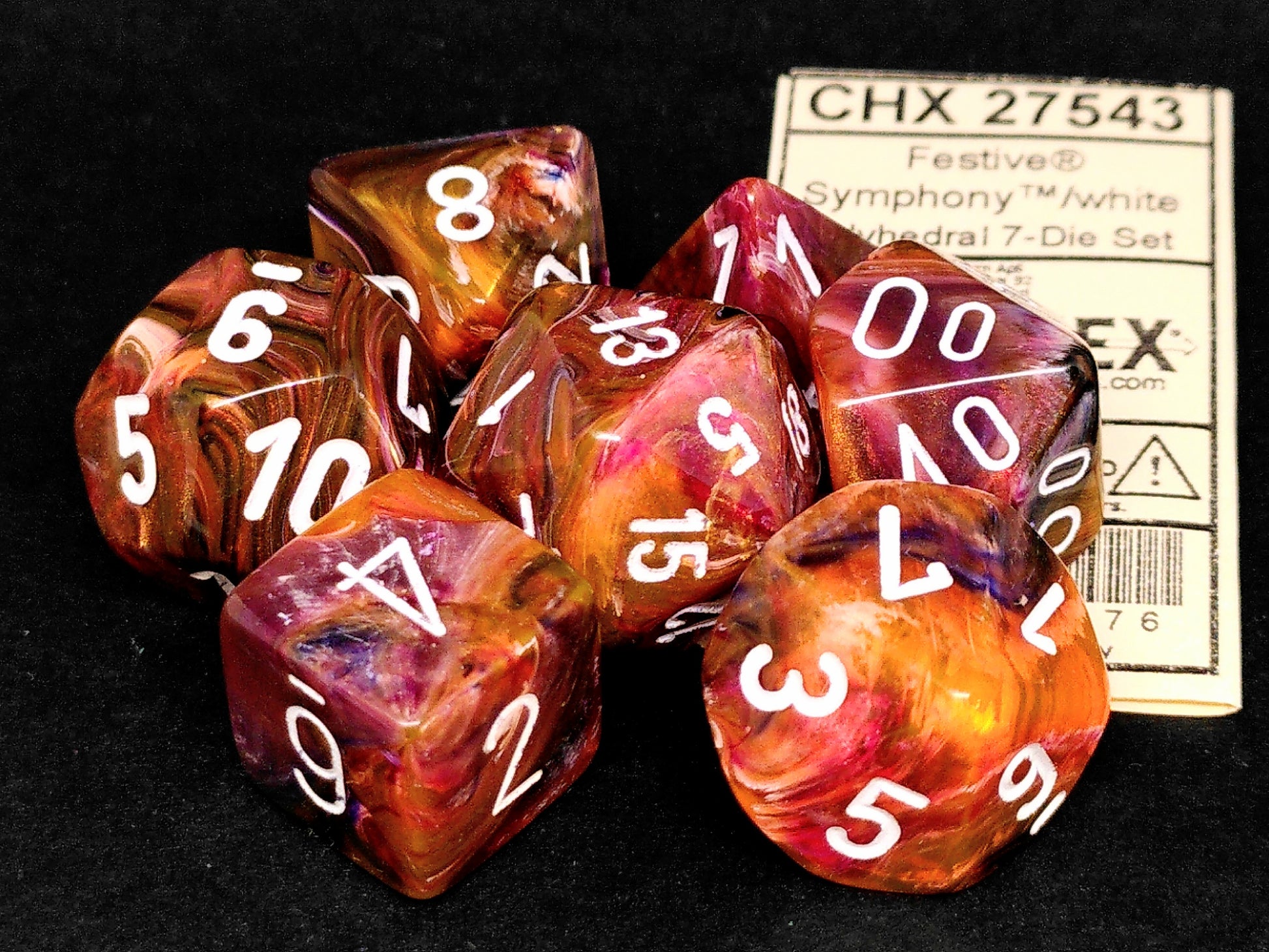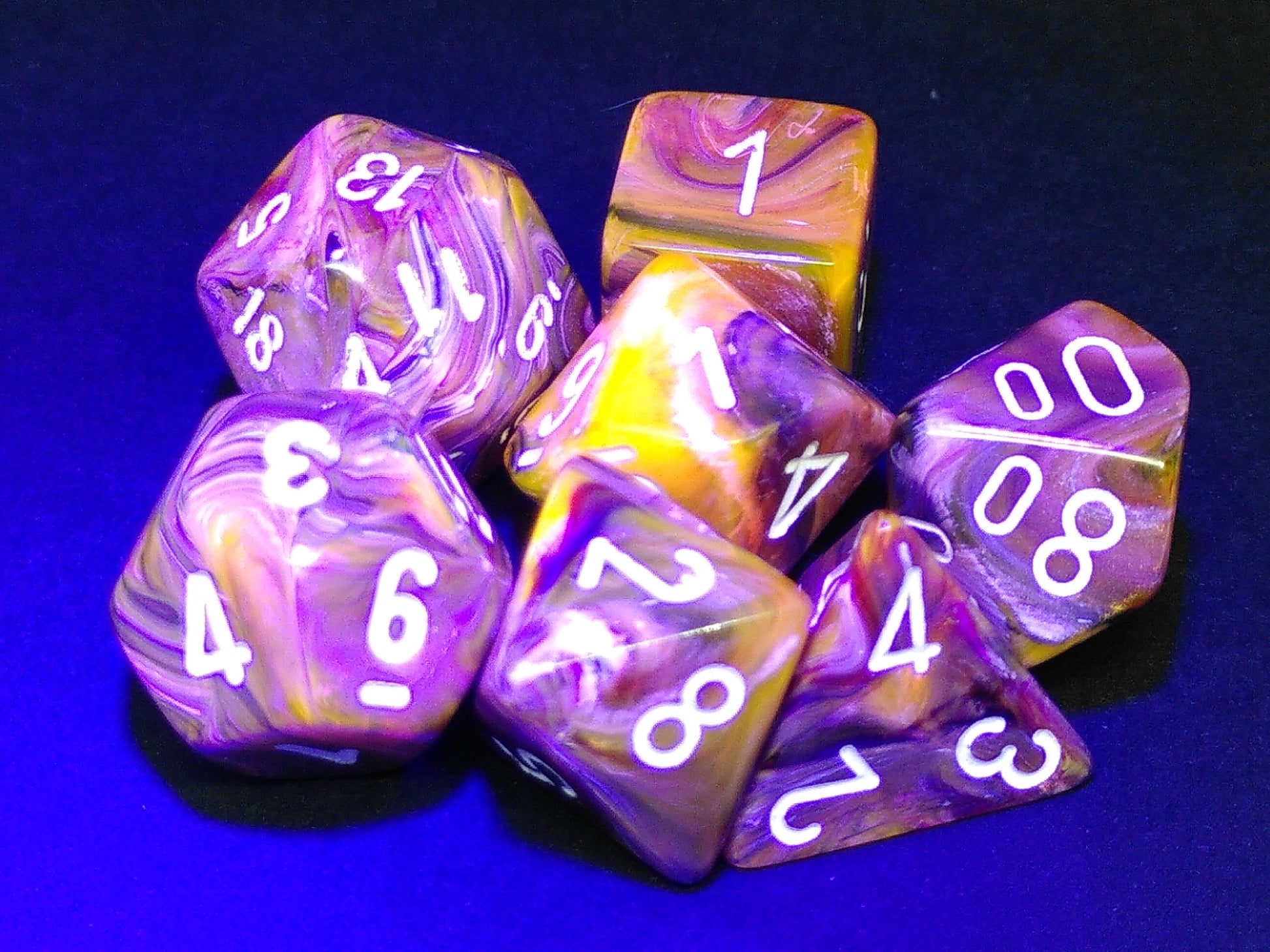 Een set van zeven Chessex dobbelstenen, semi-transparant met swirls in oranje, paars, blauw en wit. Deze set heeft een witte opdruk.Â