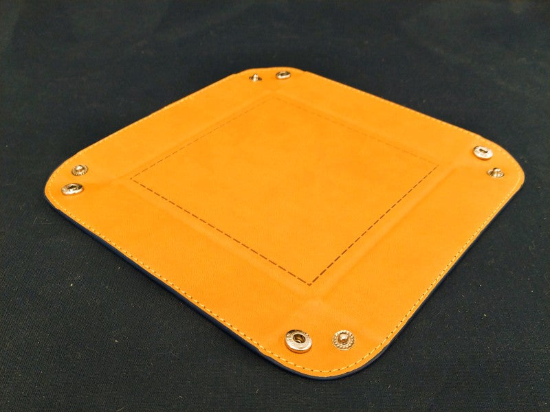 Folding dice tray made of synthetic leather, with snap studs on the corners. When unfolded, this dice tray is about 22 cm square, and as a tray it is about 17x17x4cm.
