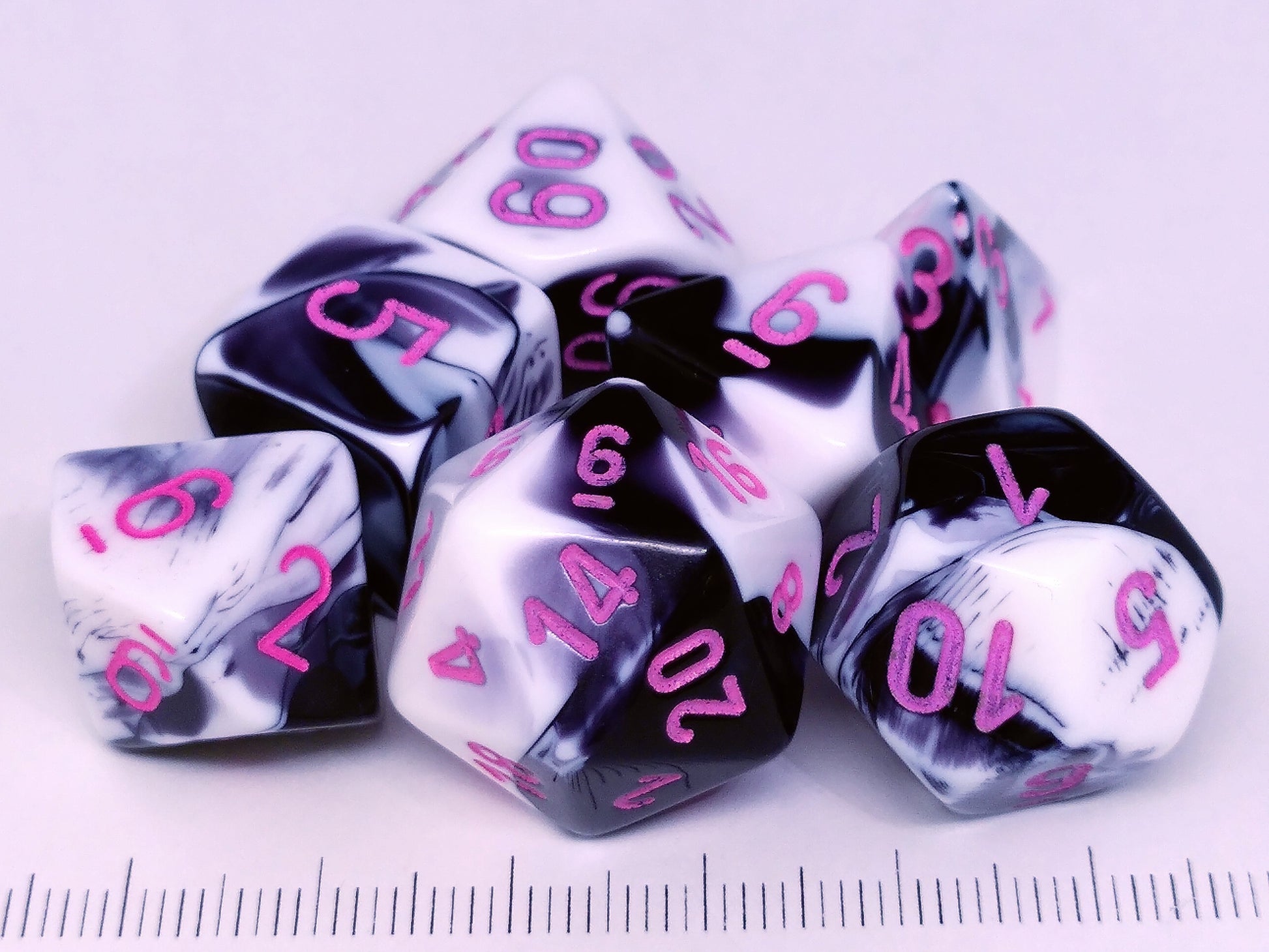 Een set van zeven Chessex dobbelstenen, gemengd wit en zwart met roze opdruk.