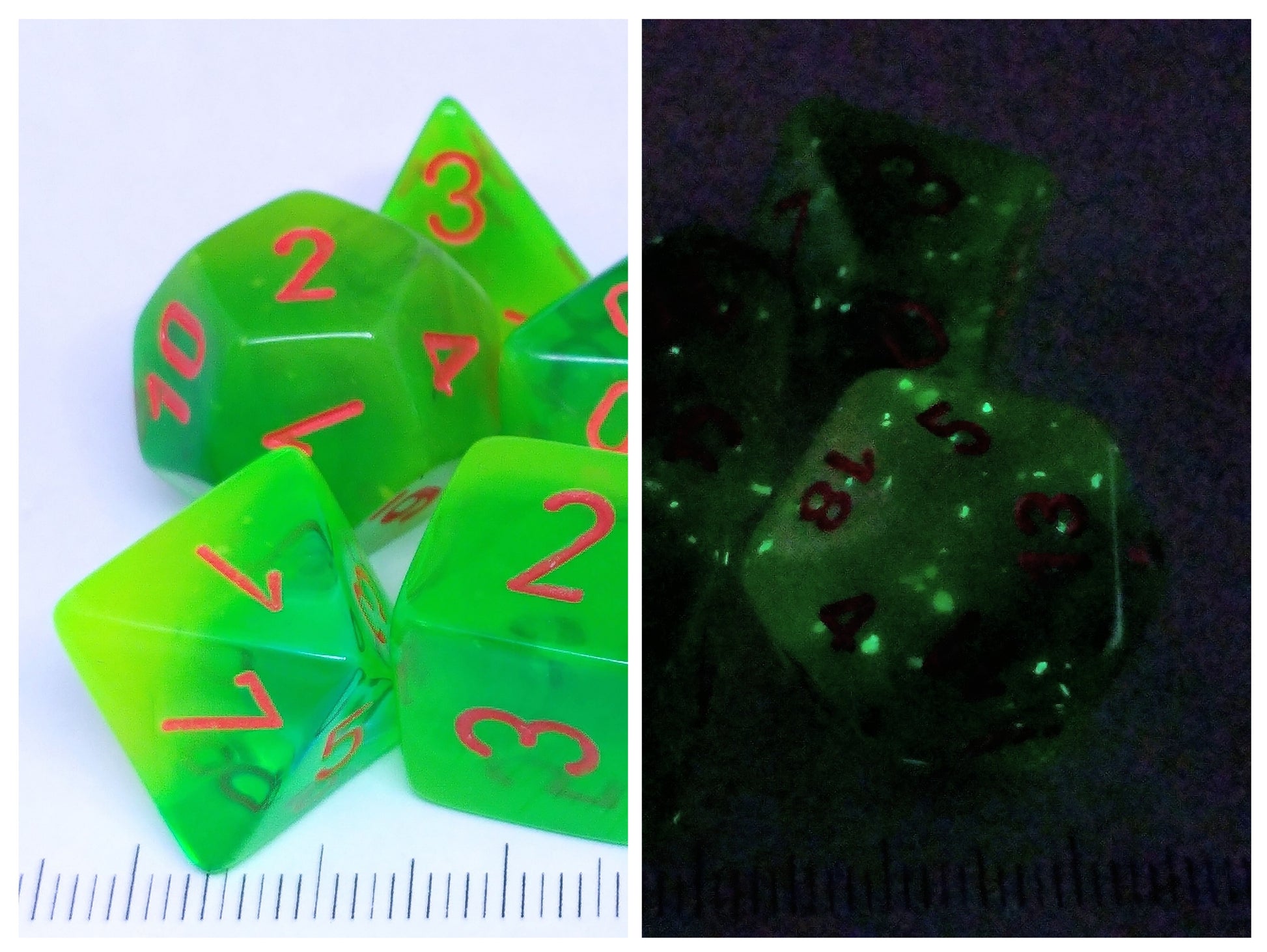 Deze set bevat zeven van de meest gangbare dobbelstenen, een elk van de volgende: