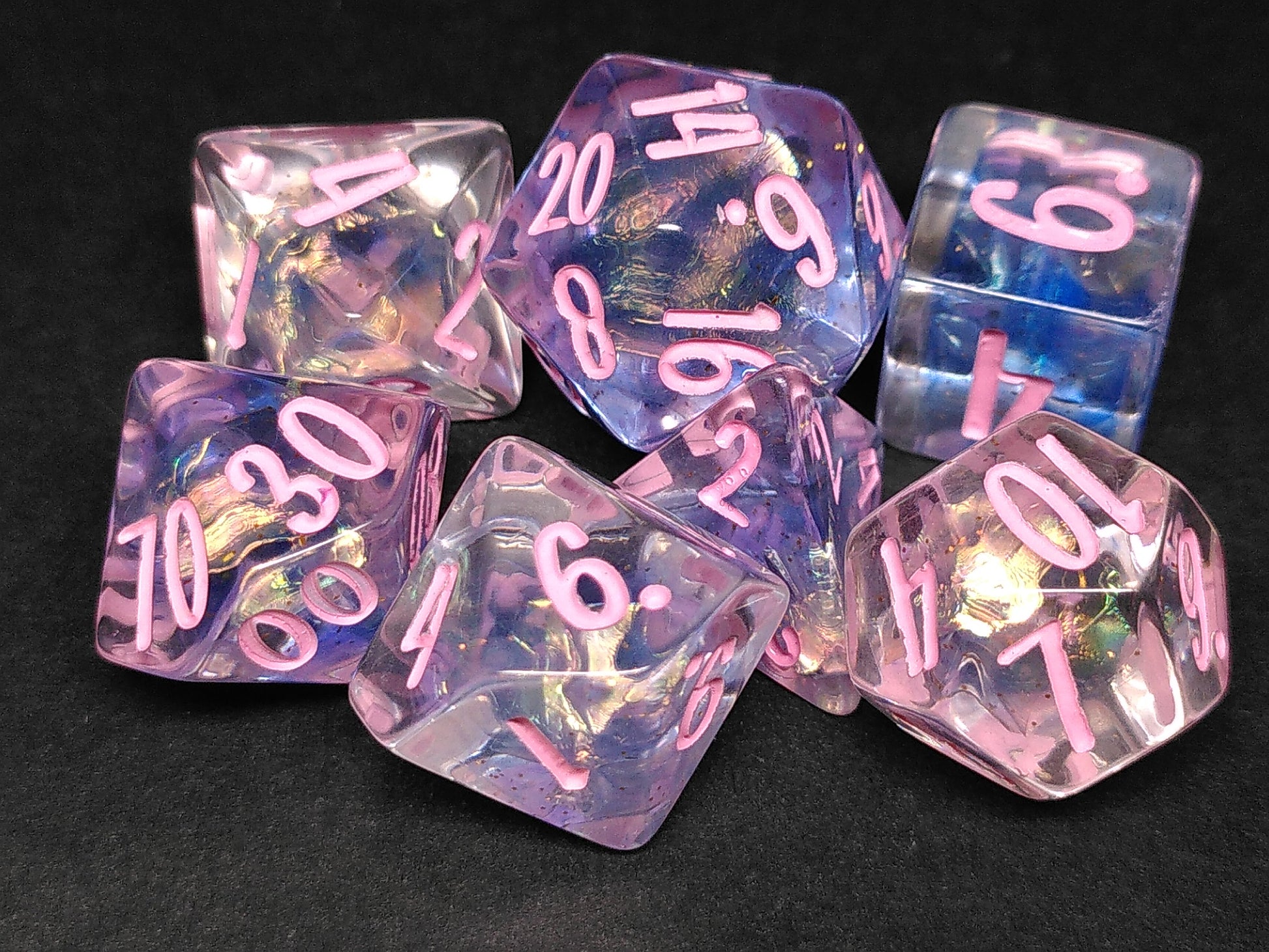 A polydice set of colourless and blue transparent resin, with pink numbers in a playful script.
