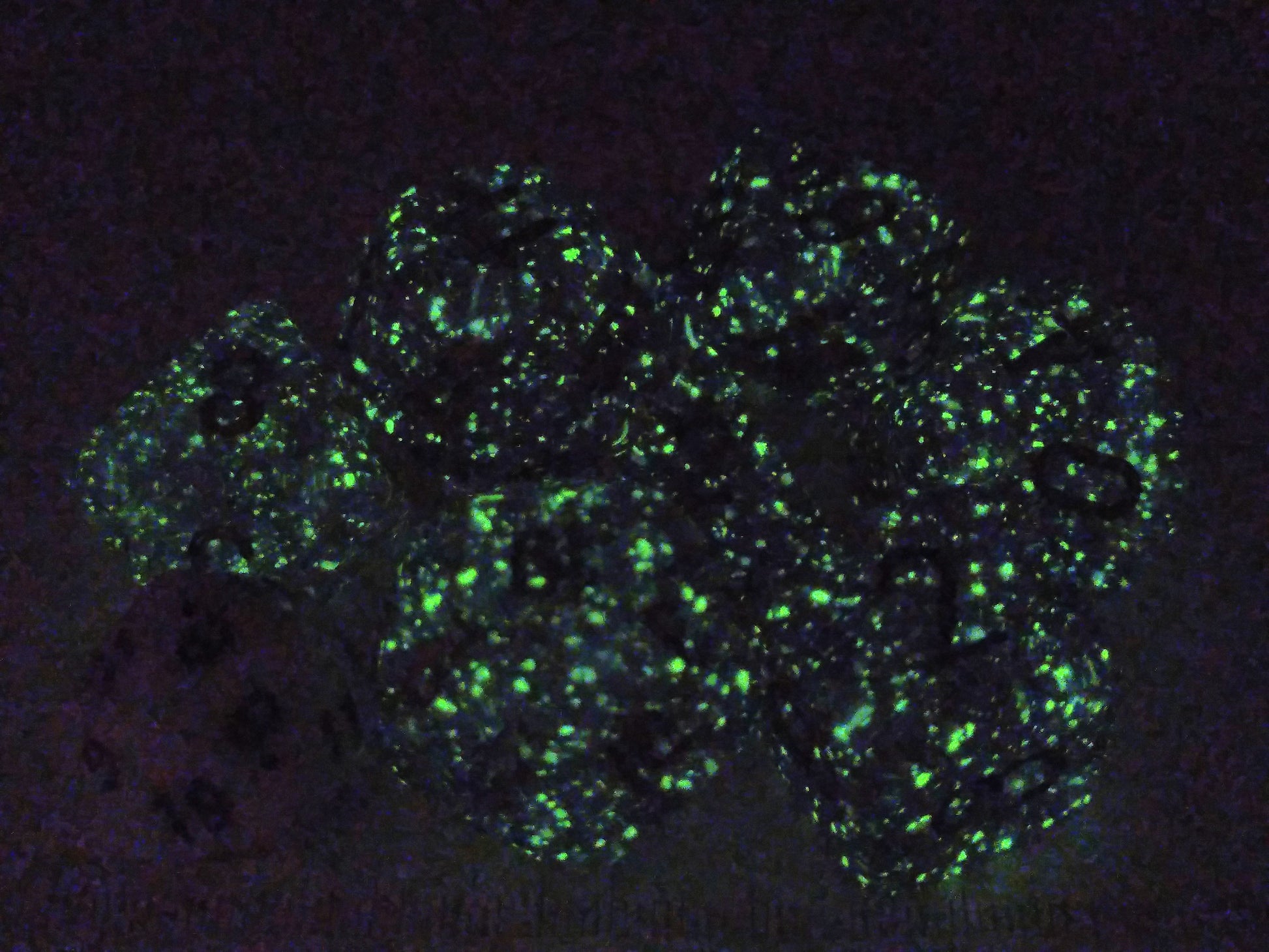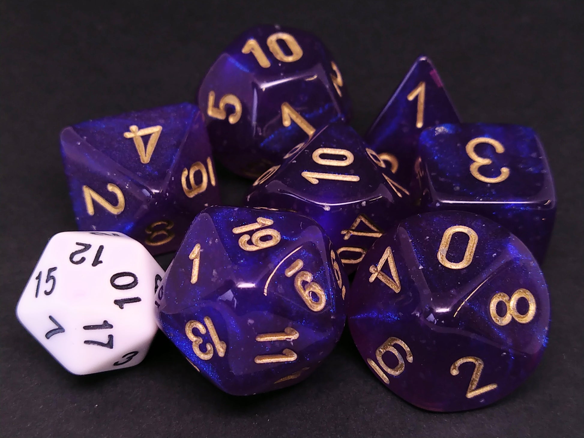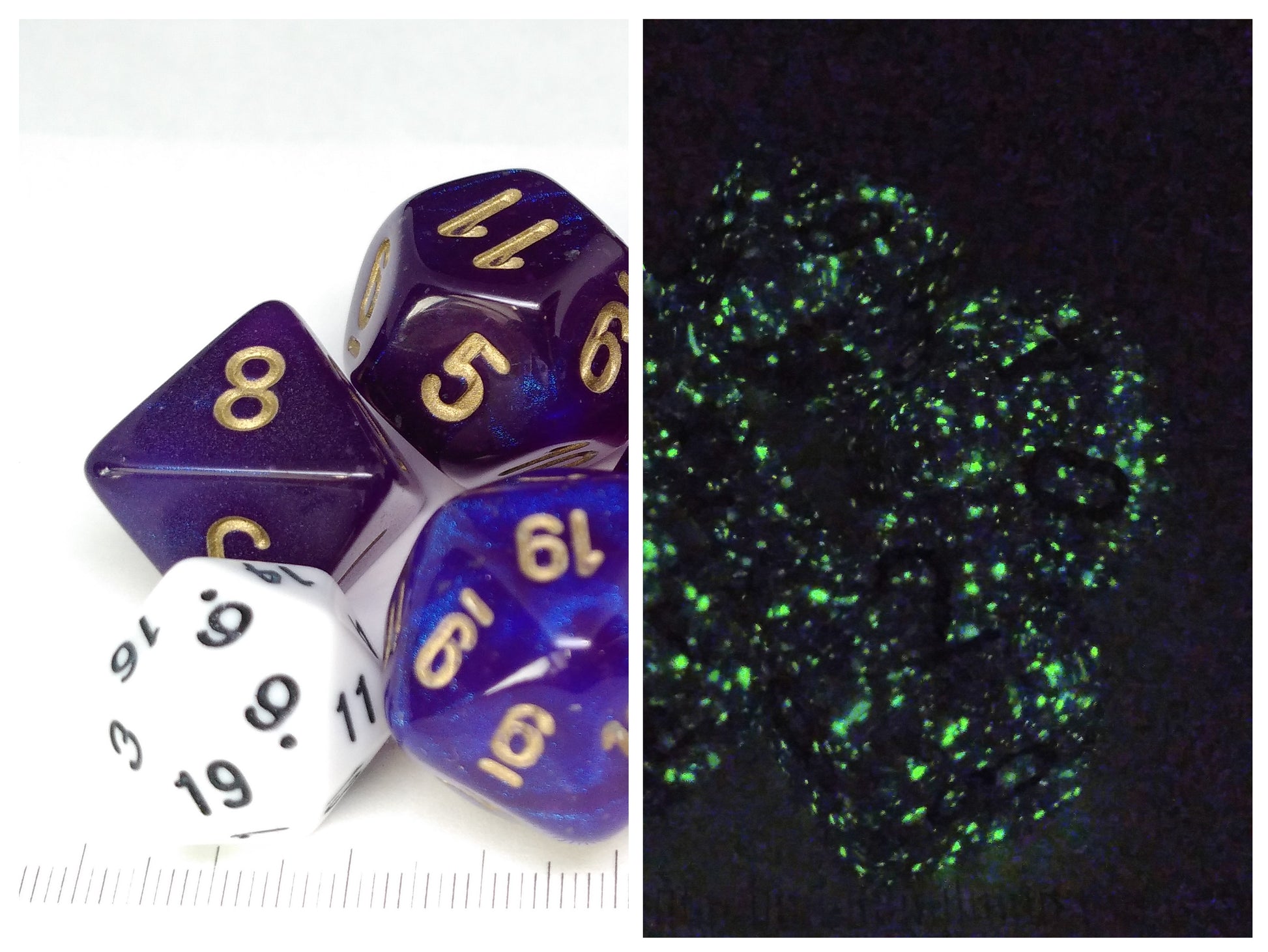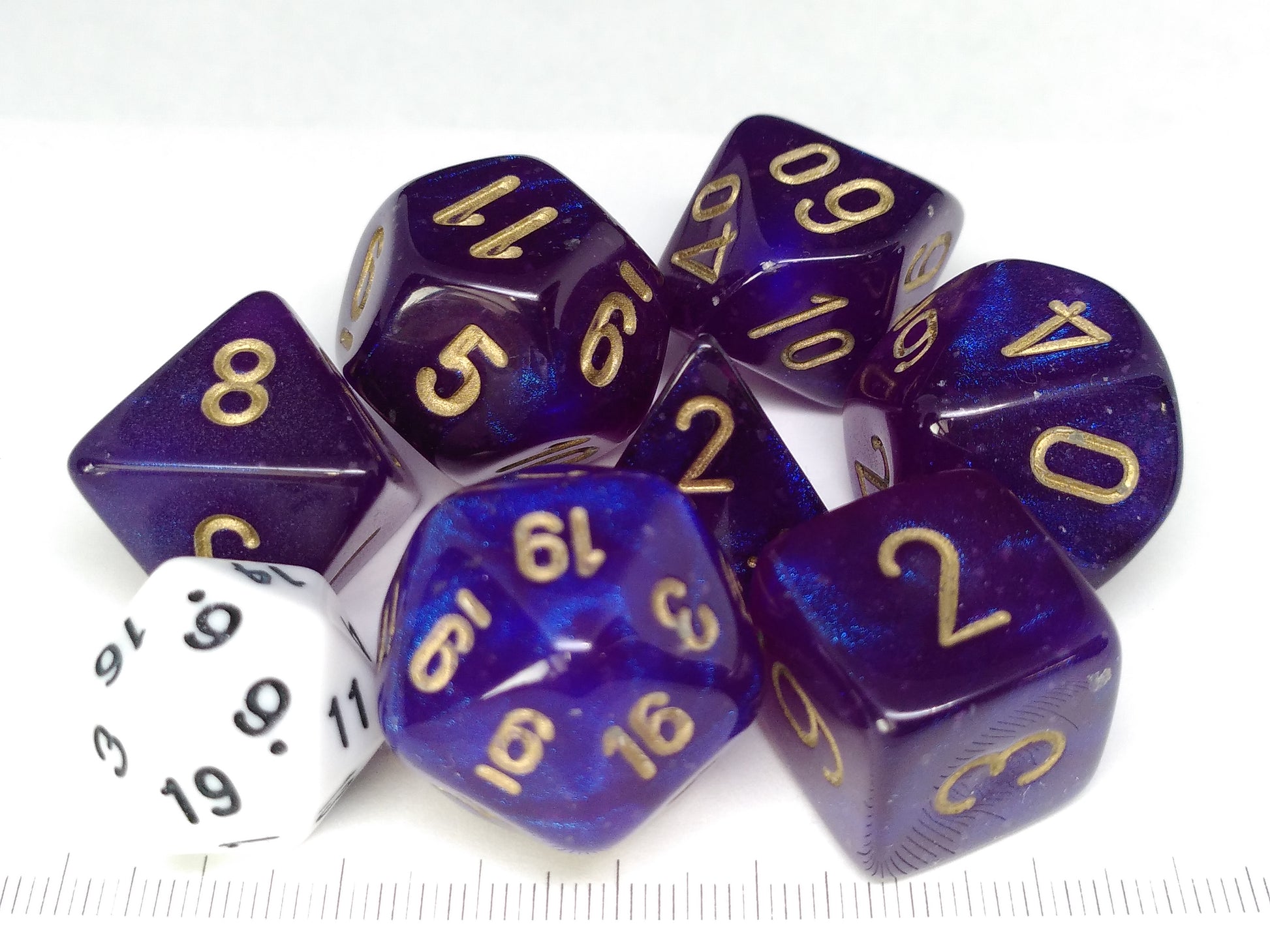 An extra large polydice set of 7 pieces by Chessex, semi transparent purple with blue glitter, with gold-coloured print. These dice light up in the dark.