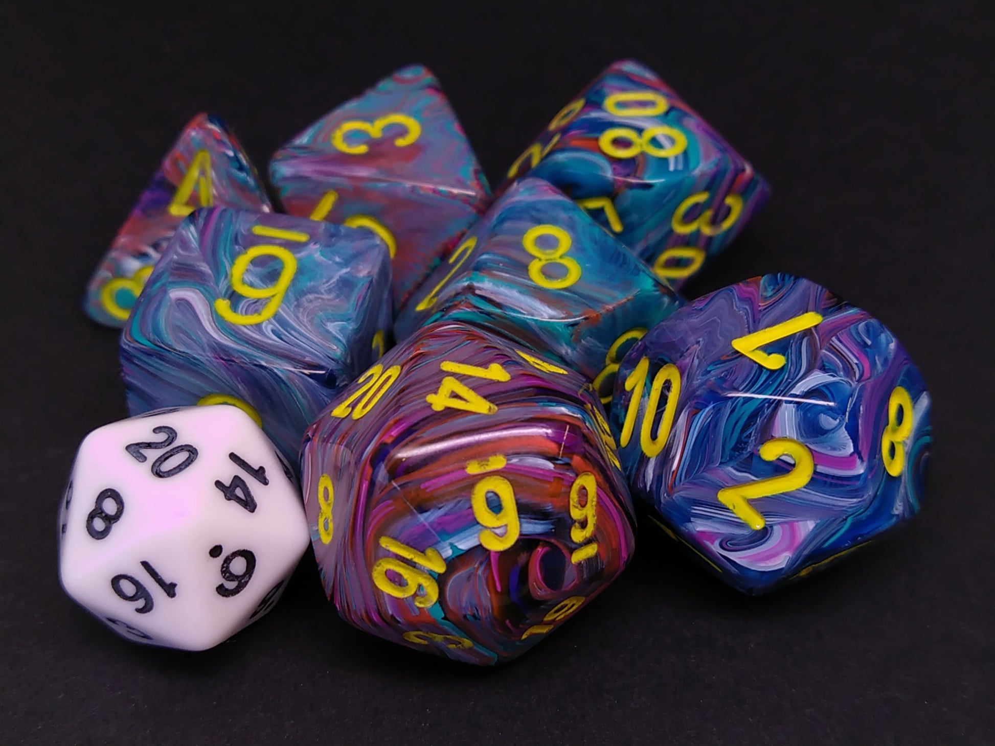 An set of 7 extra large polydice by Chessex, marbled opaque purple, turquoise and white, with yellow print. These dice glow under UV light.