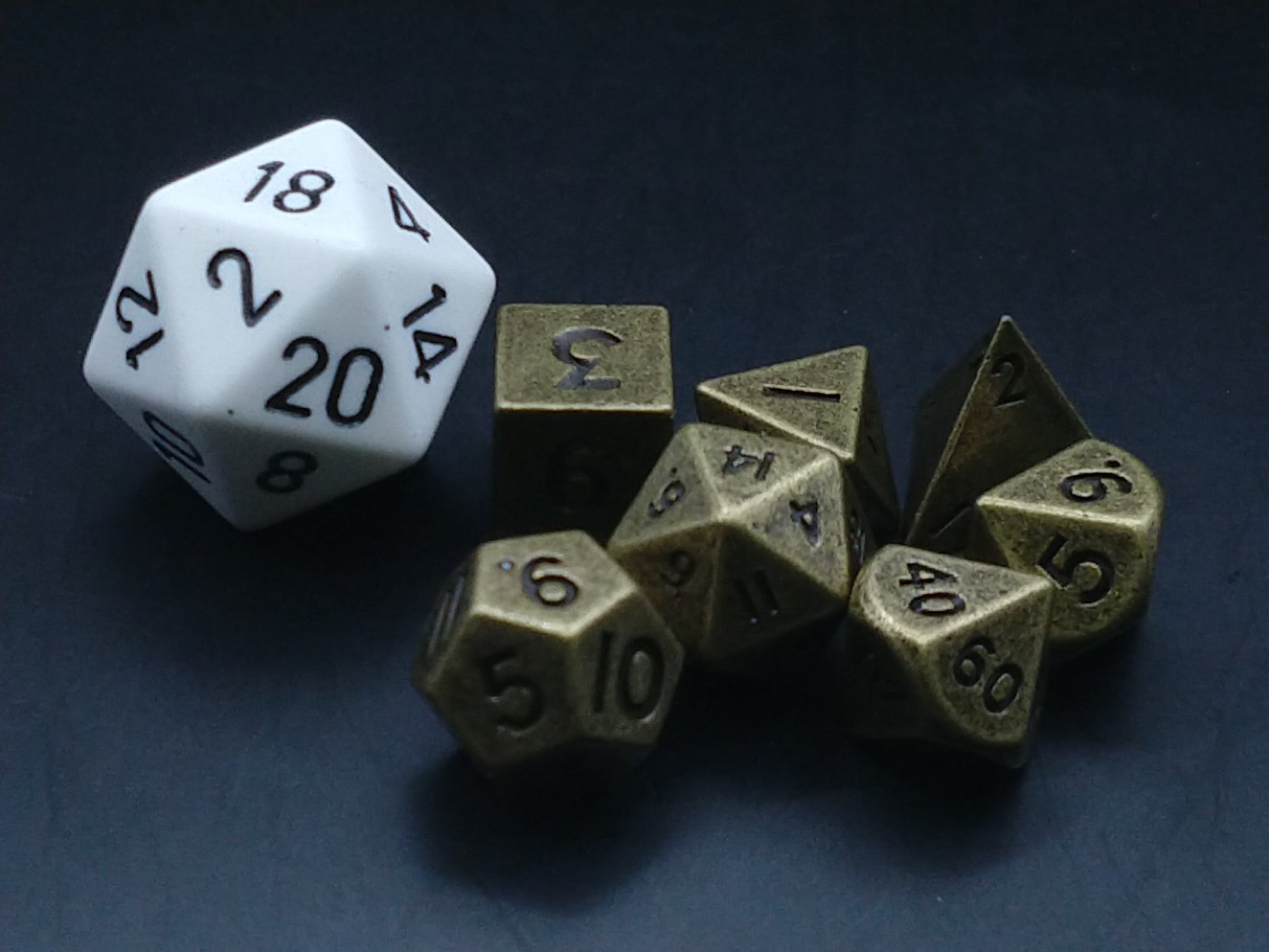 A set of seven miniature metal dice, copper-colored with dark numbers.