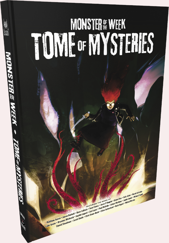 In the Monster of the Week roleplaying game, hunters must solve all manner of mysteries before they can save the day. The Tome of Mysteries expands their options—and magnifies their peril with a wide variety of GMing advice, essays, rules, and mysteries from the Monster of the Week “Roadhouse Regulars” online community.