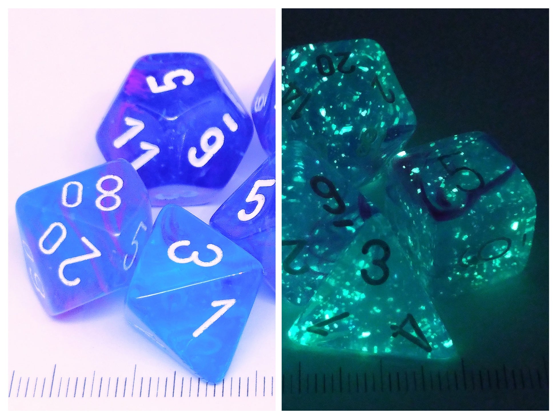 Deze set bevat zeven van de meest gangbare dobbelstenen, een elk van de volgende: