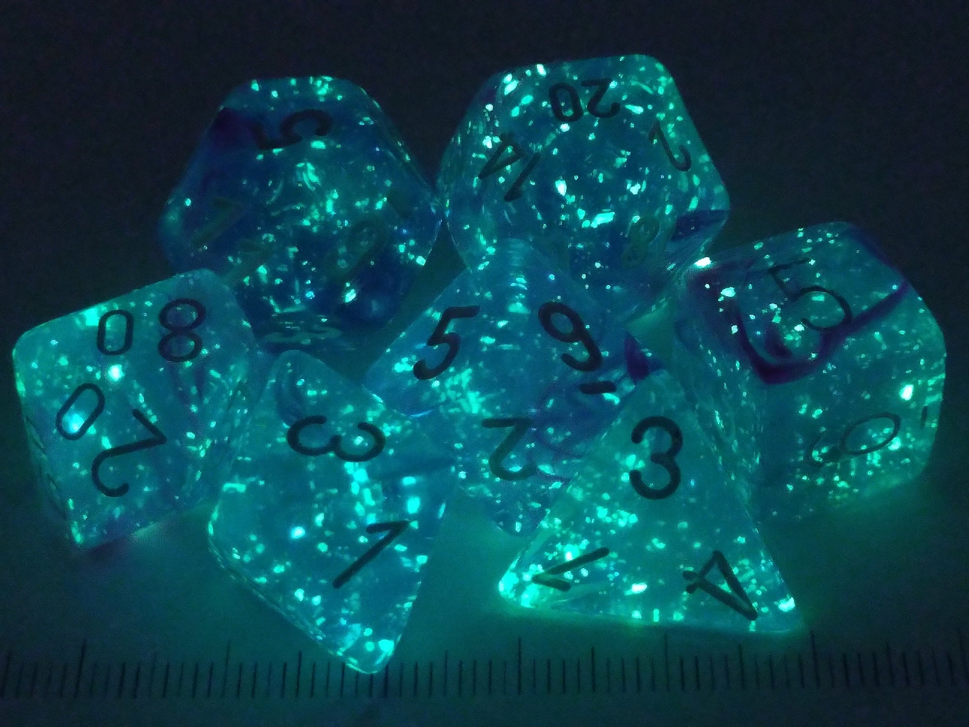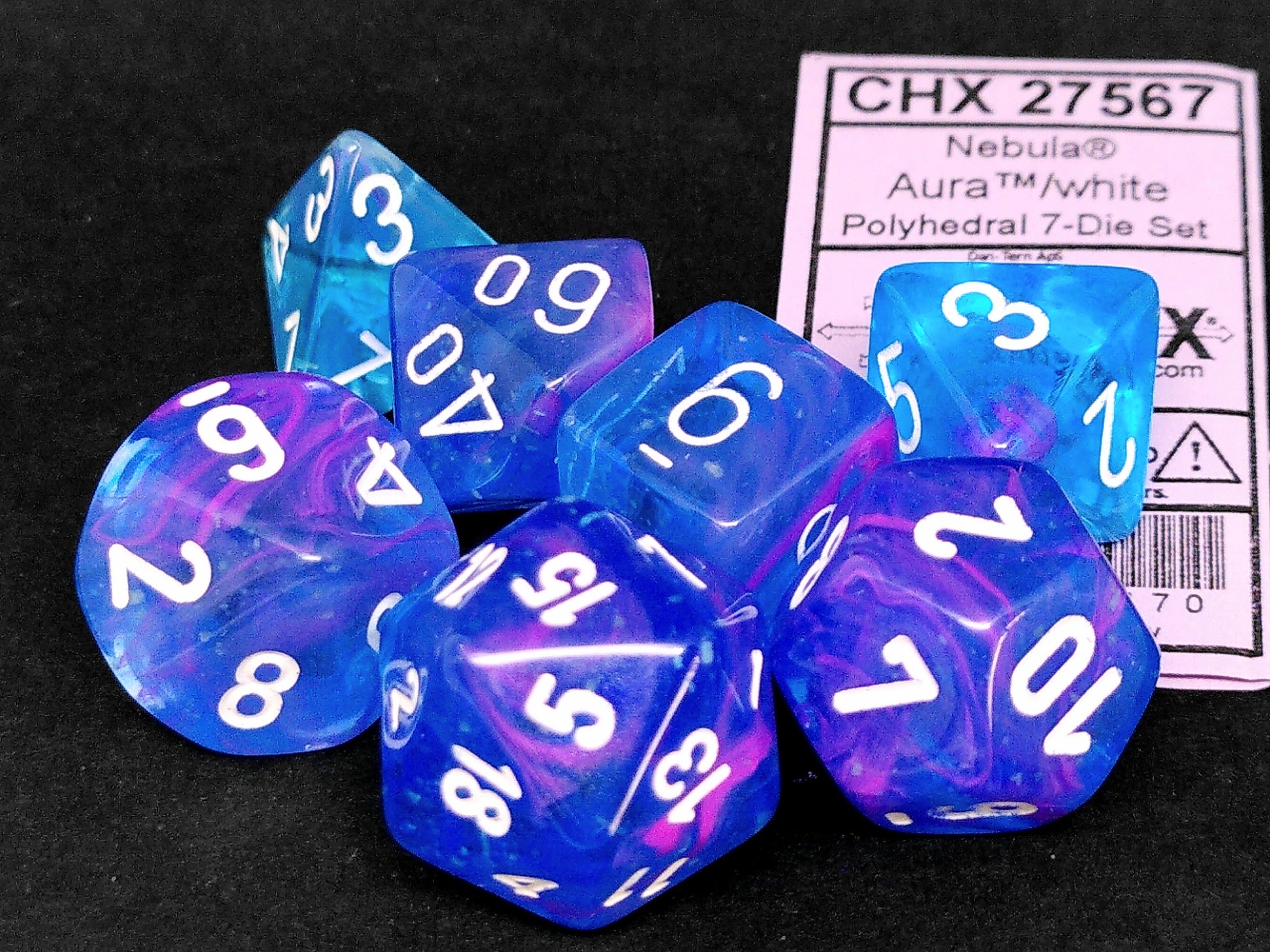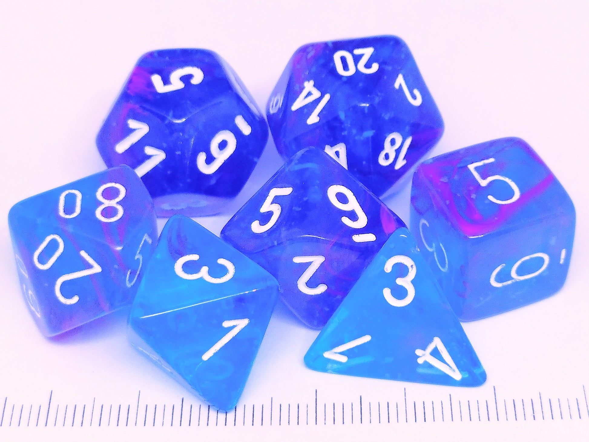 Een set van zeven Chessex dobbelstenen in semi-transparant blauw/paars.Â