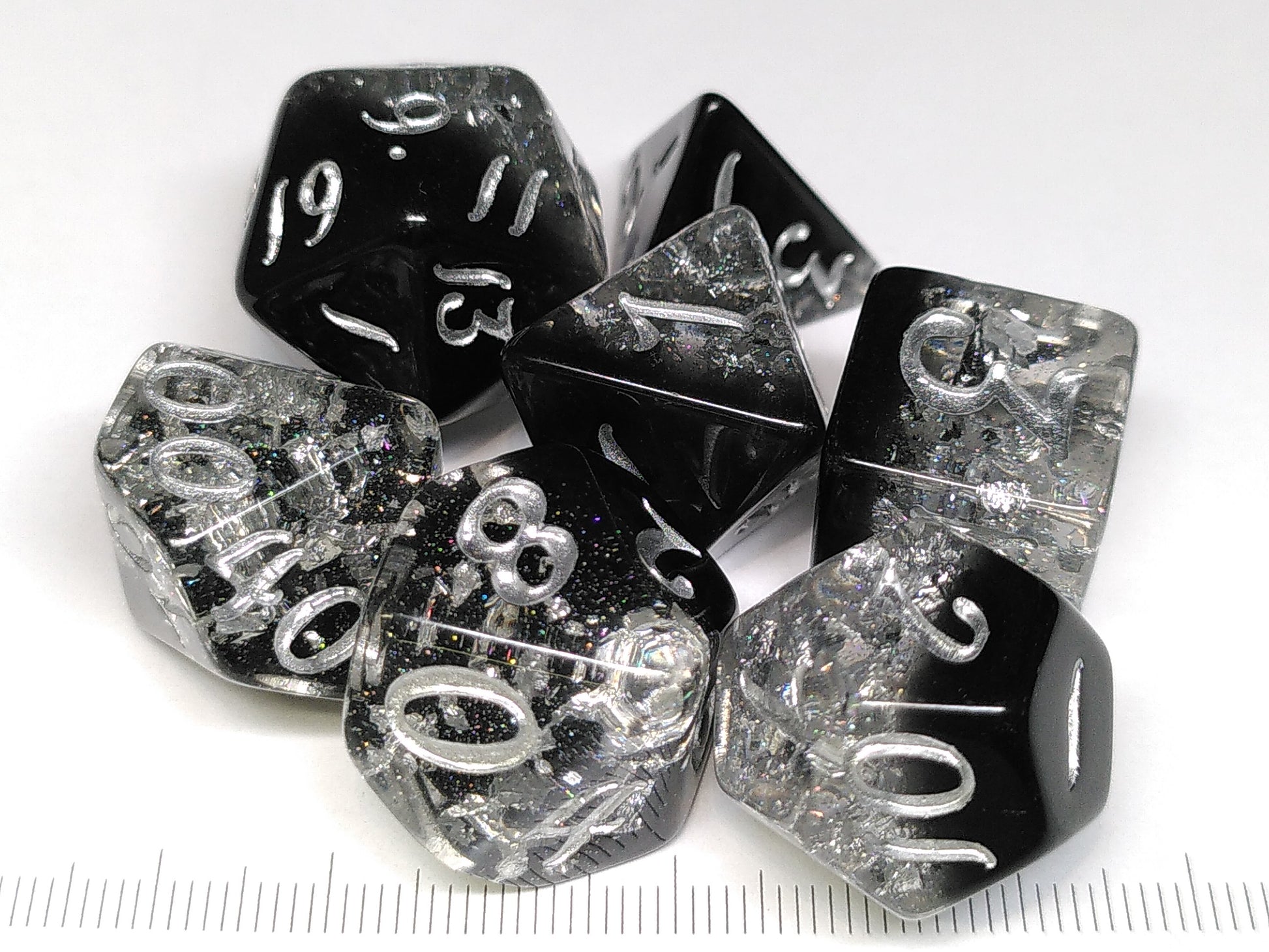 A polydice set of black and colorless transparent resin with silver foil fragments, featuring silver-colored numbers in an elegant script.