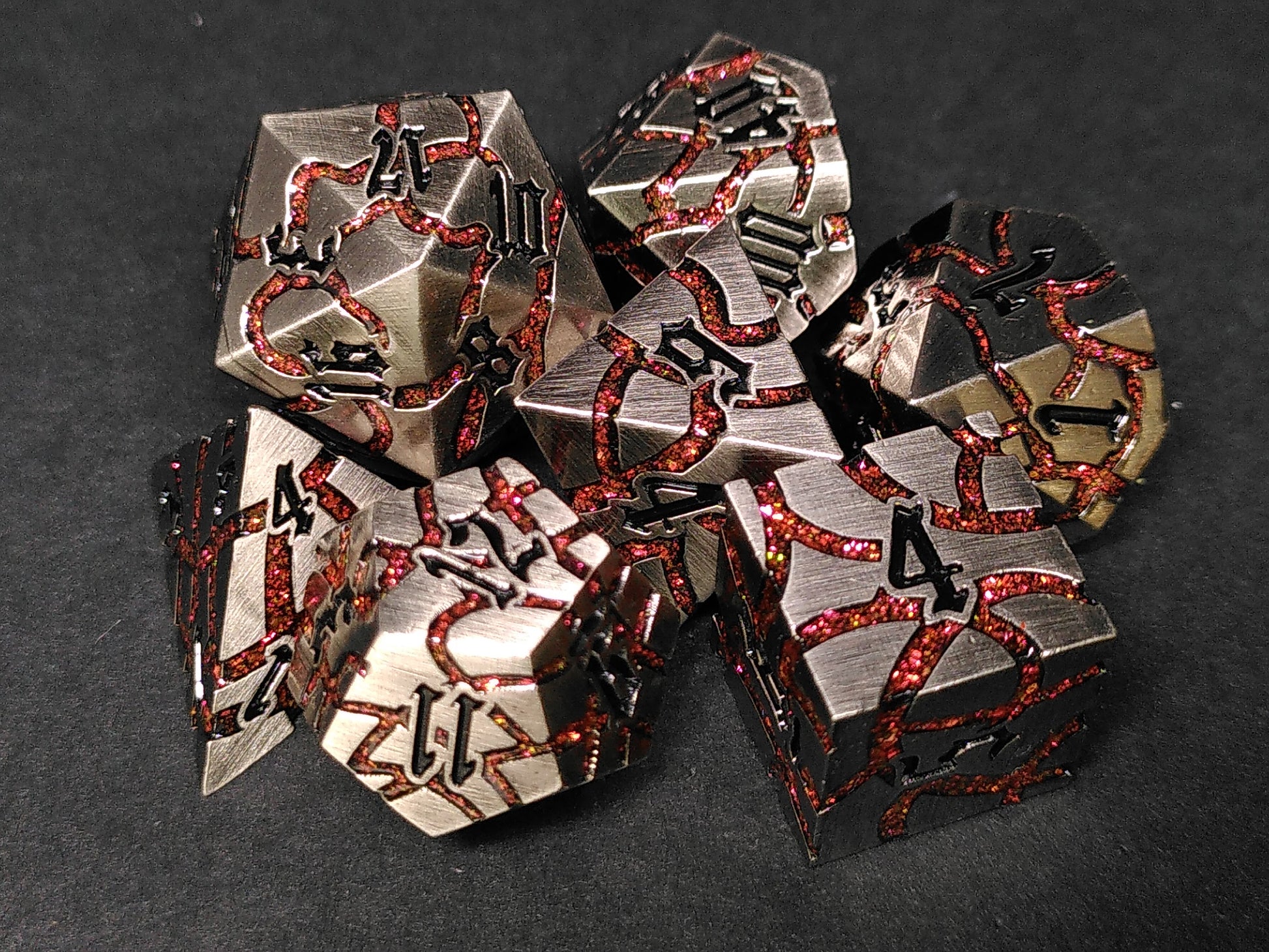 A set of seven silver-colored metal dice. They feature copper-colored, glittering resin grooves and black numbers.