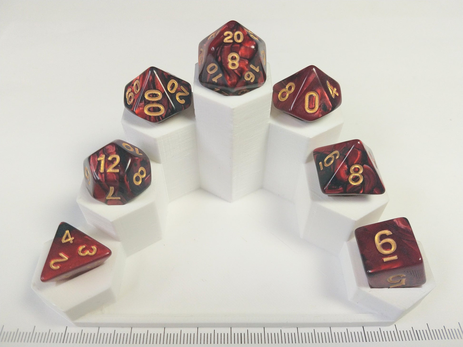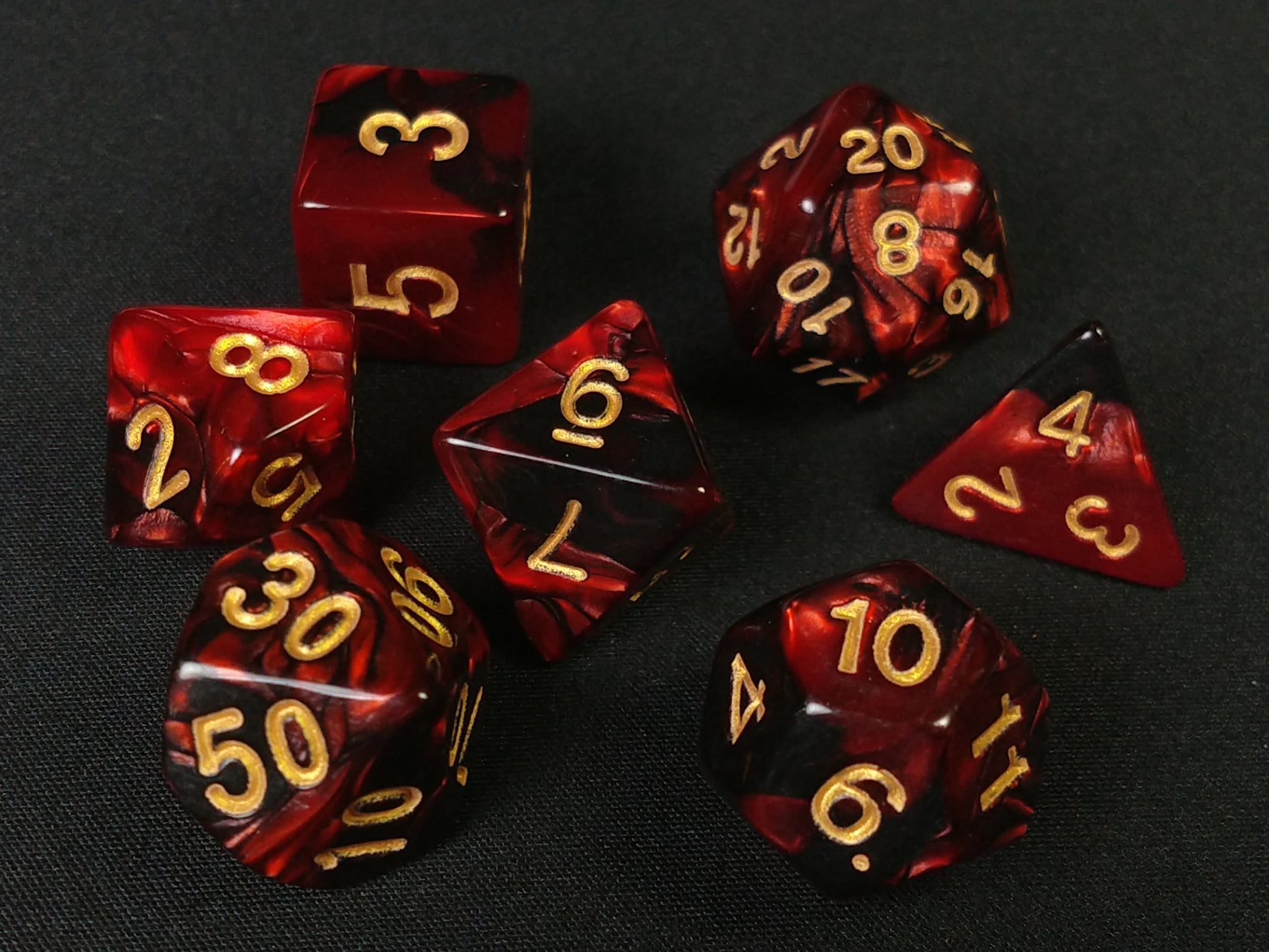A set of seven dice, marbled red/black with gold-colored print.