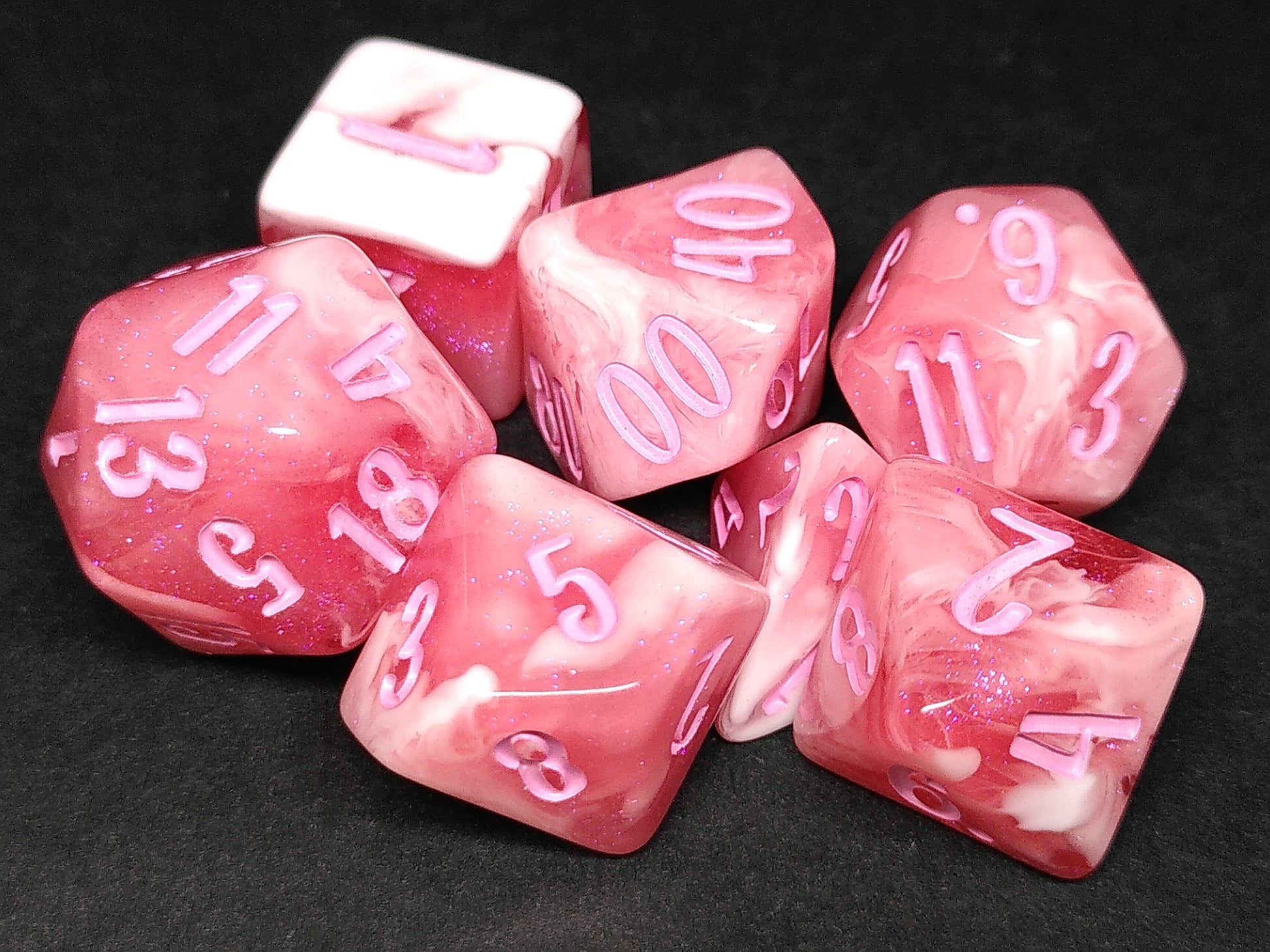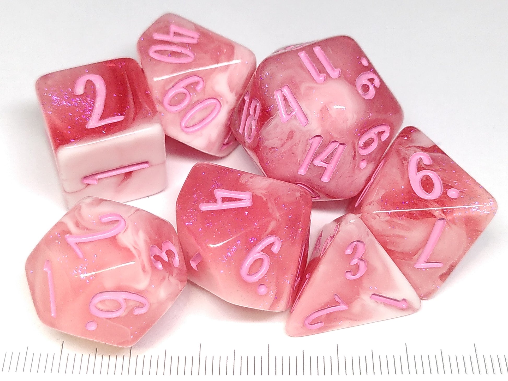 A polydice set of marbled pink resin, with light pink numbers in a playful script.