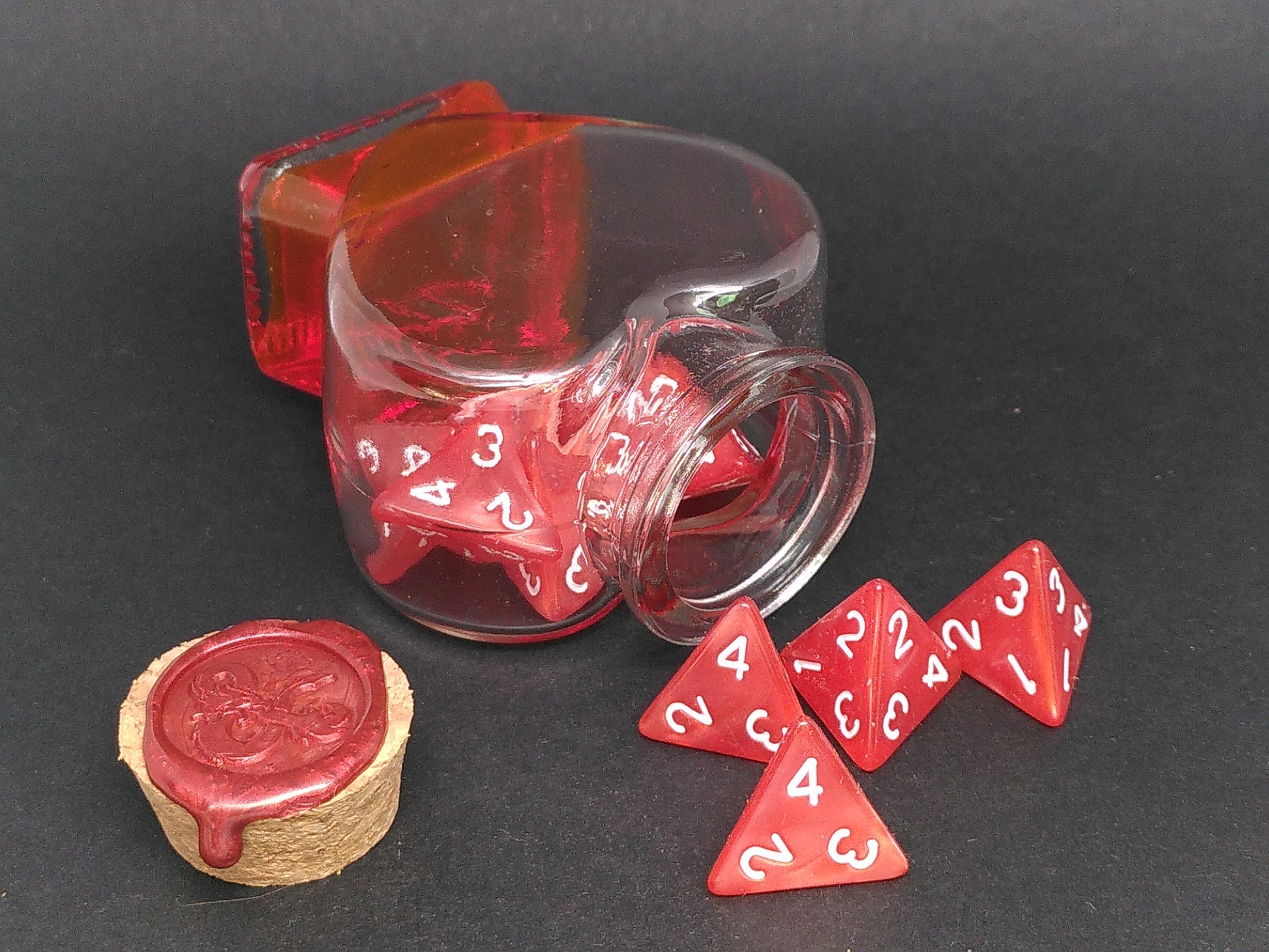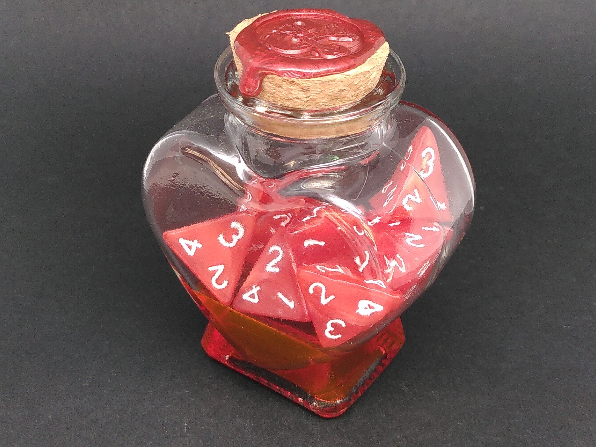 A heart-shaped bottle with cork and wax seal, containing ten red d4s.