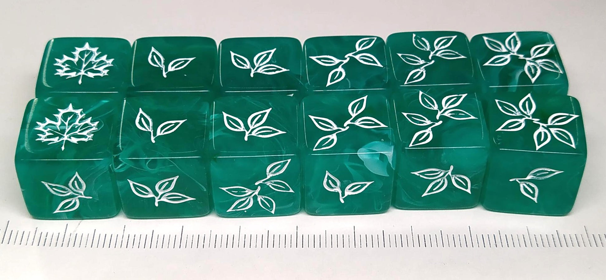 A set of 12 6-sided dice, semi-transparent and green with white swirls and white engraving. Each die has 6 faces featuring stylized leaves; the number of leaves indicates the face number.