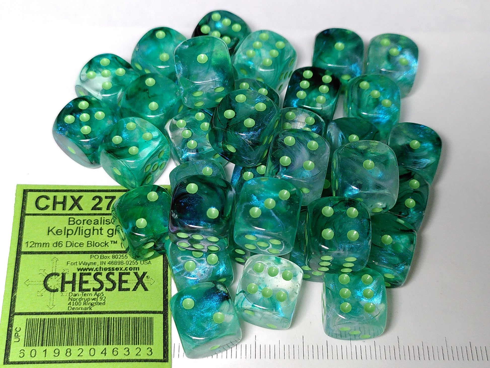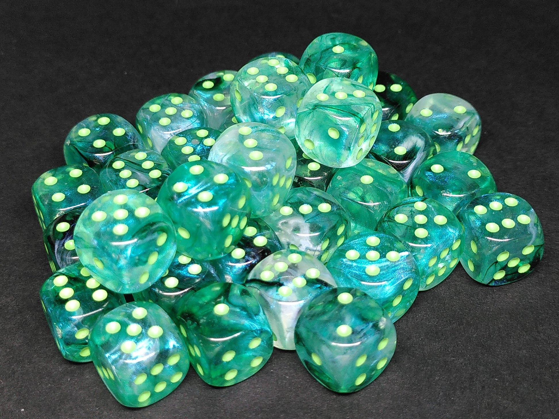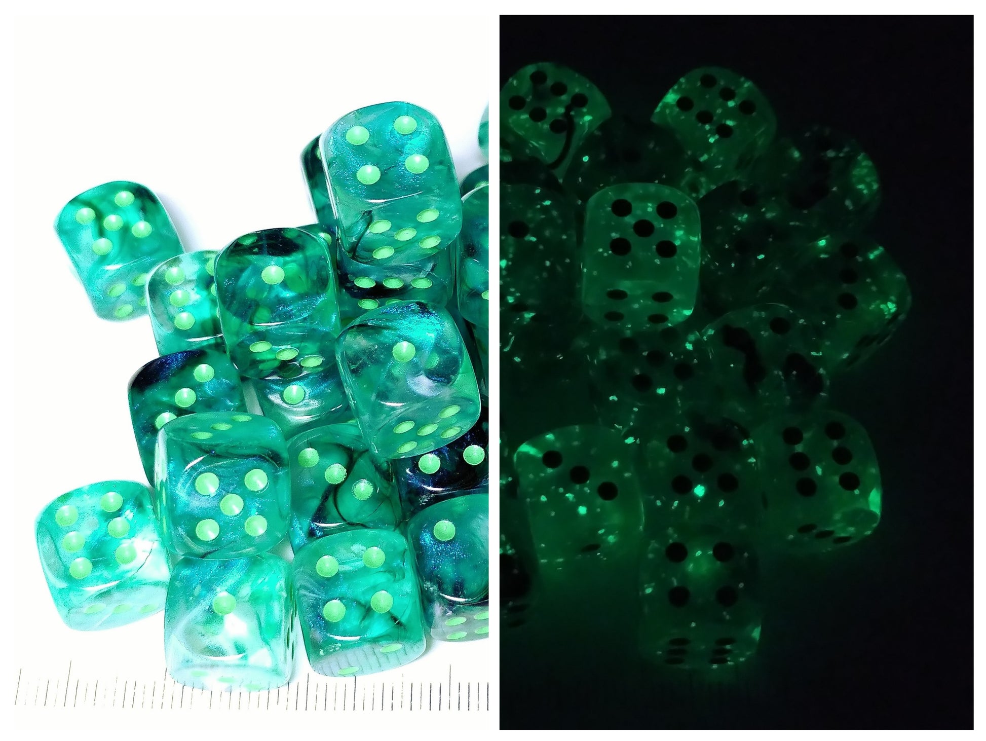 36 6-zijdige, 12mm Chessex dobbelstenen, transparant met groene werveling en glinsterende blauwe zweem, met lichtgroene opdruk. Deze dobbelstenen hebben lichtgevende deeltjes en gloeien op in het donker.