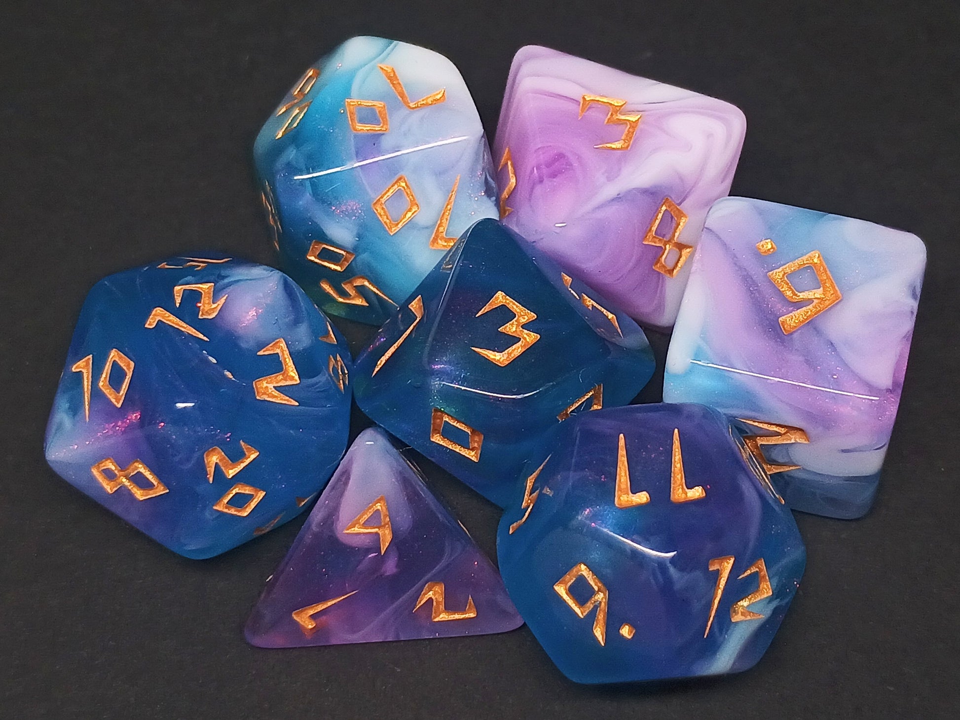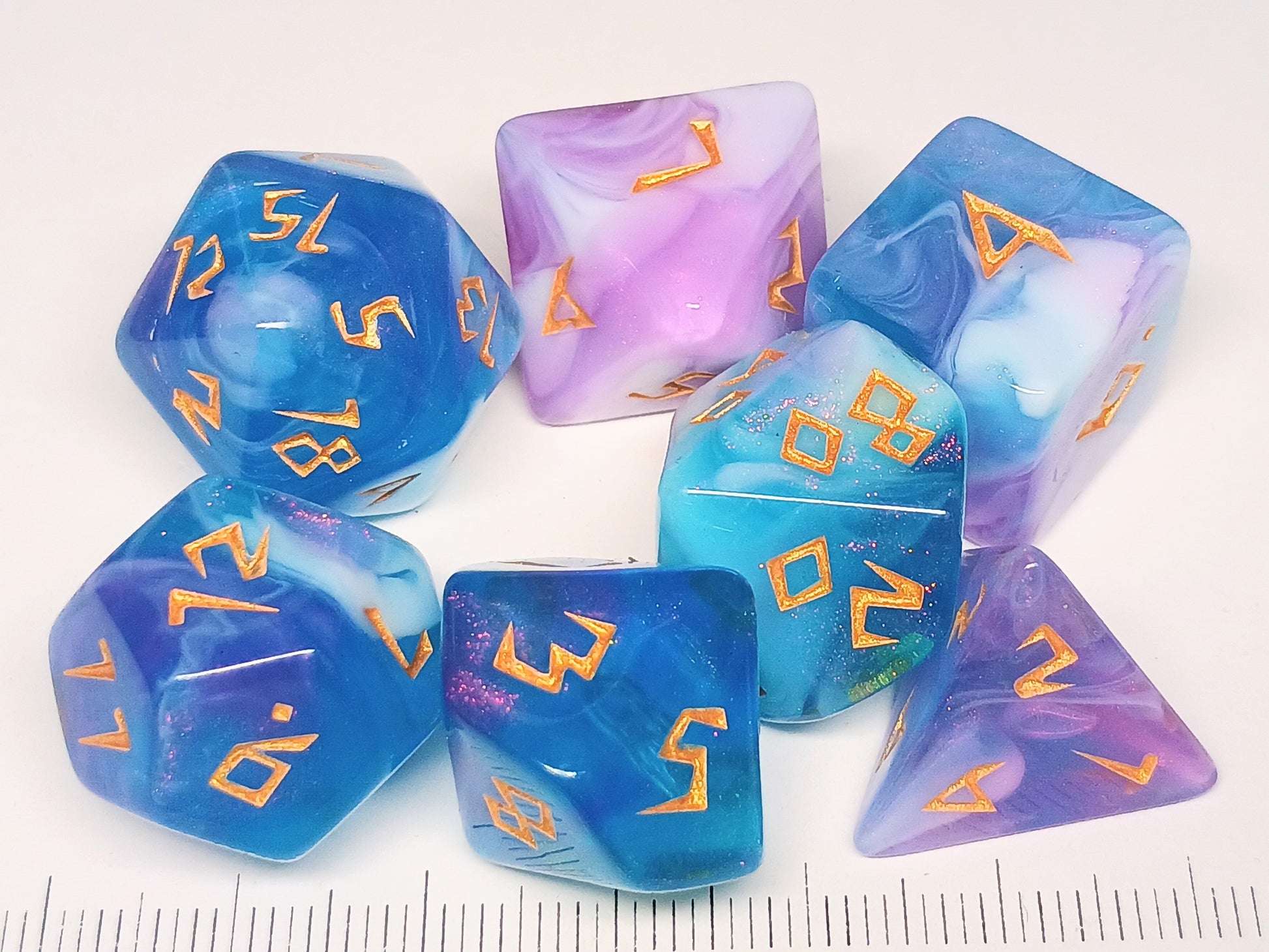 A set of seven marbled dice in blue, white and purple with glitter, this set has gold colored numbers in a carved script.