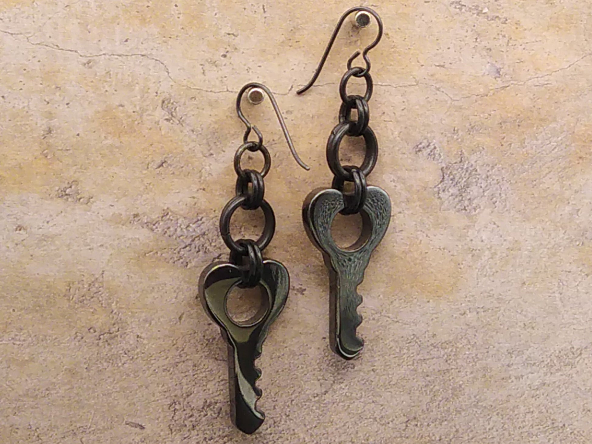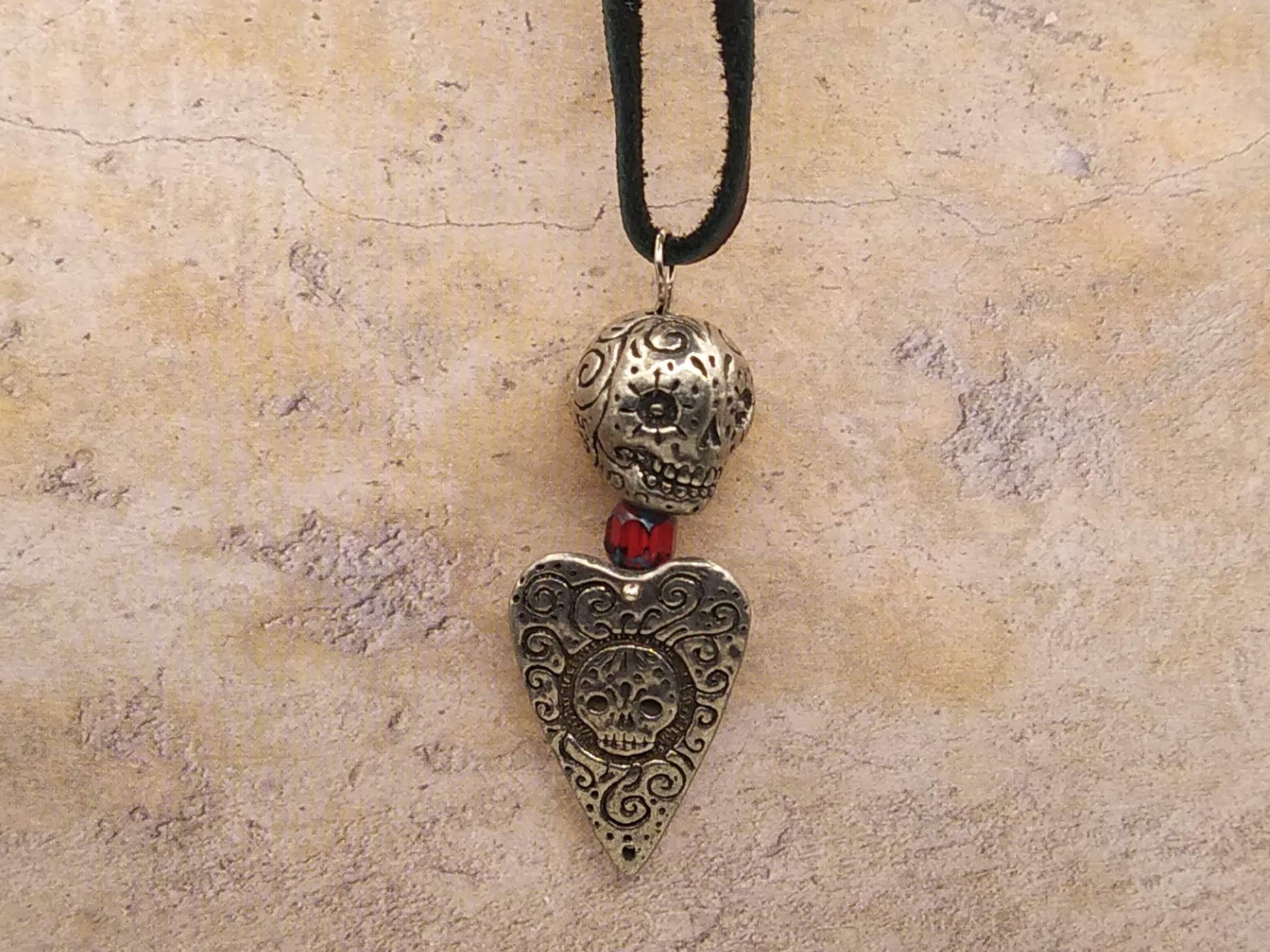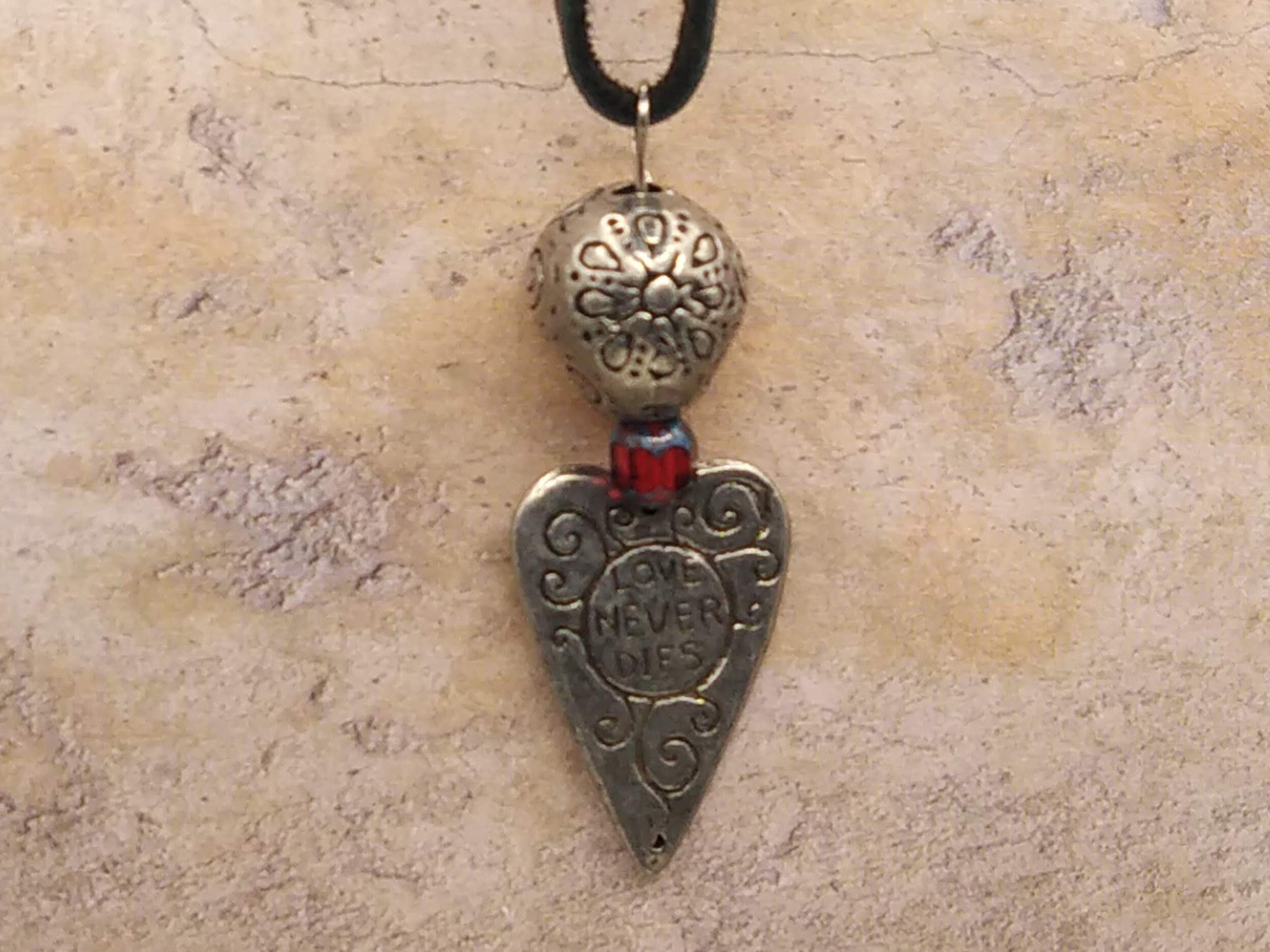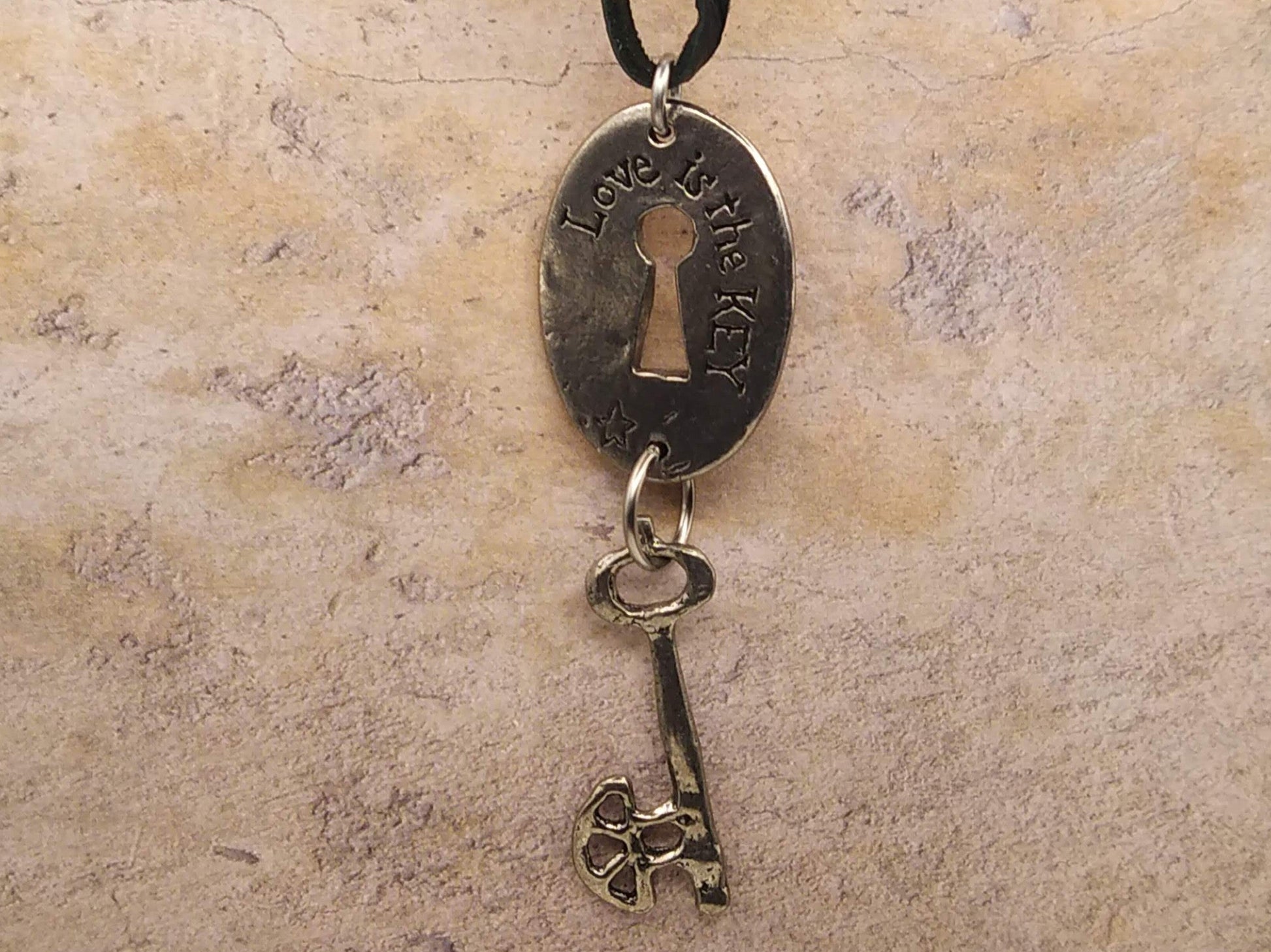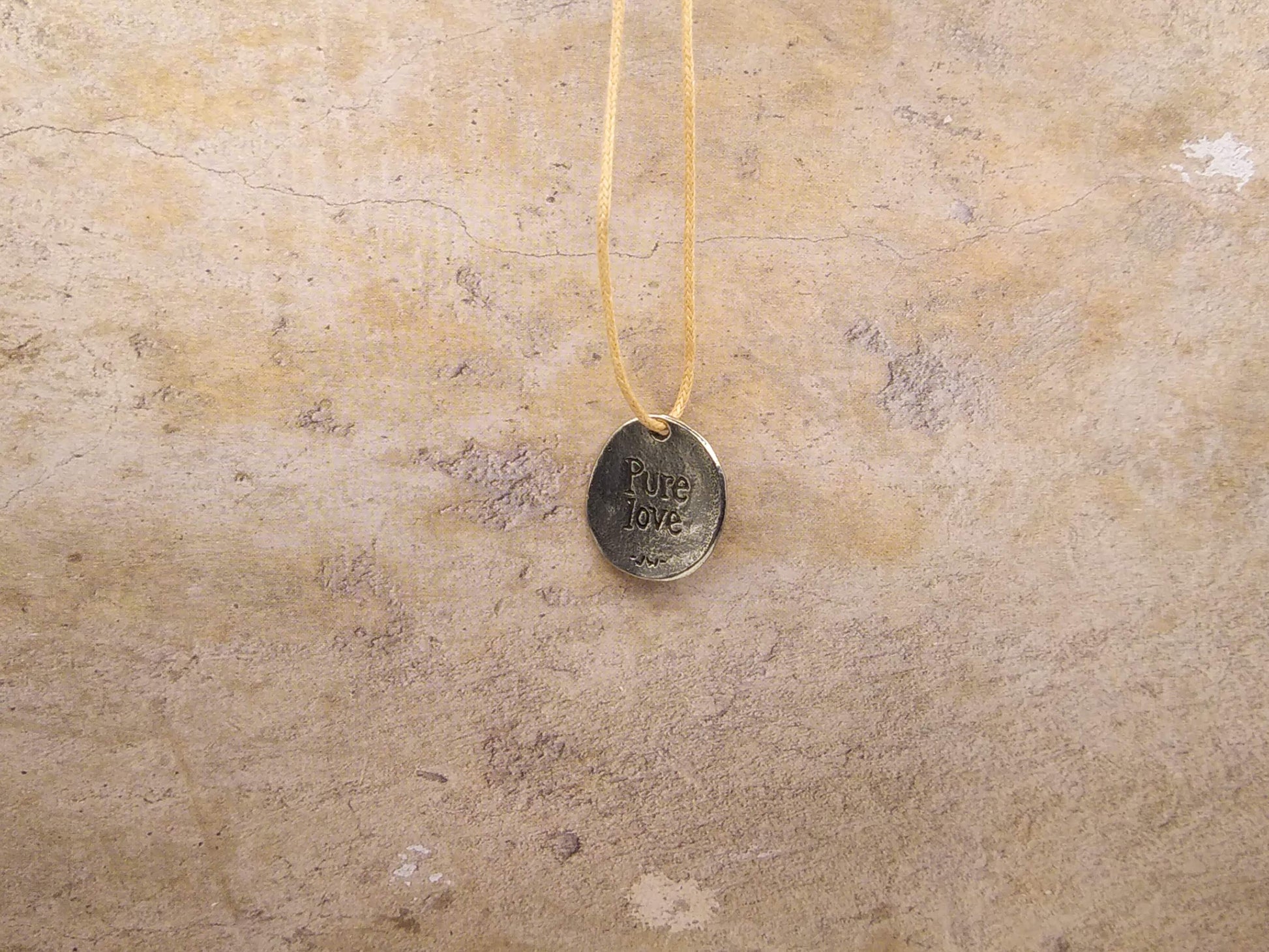 Een collectie sieraden met als thema liefde. Verschillende hangers aan een leren of gewaxt koord en een paar oorbellen van metaal met titanium oorhaken
