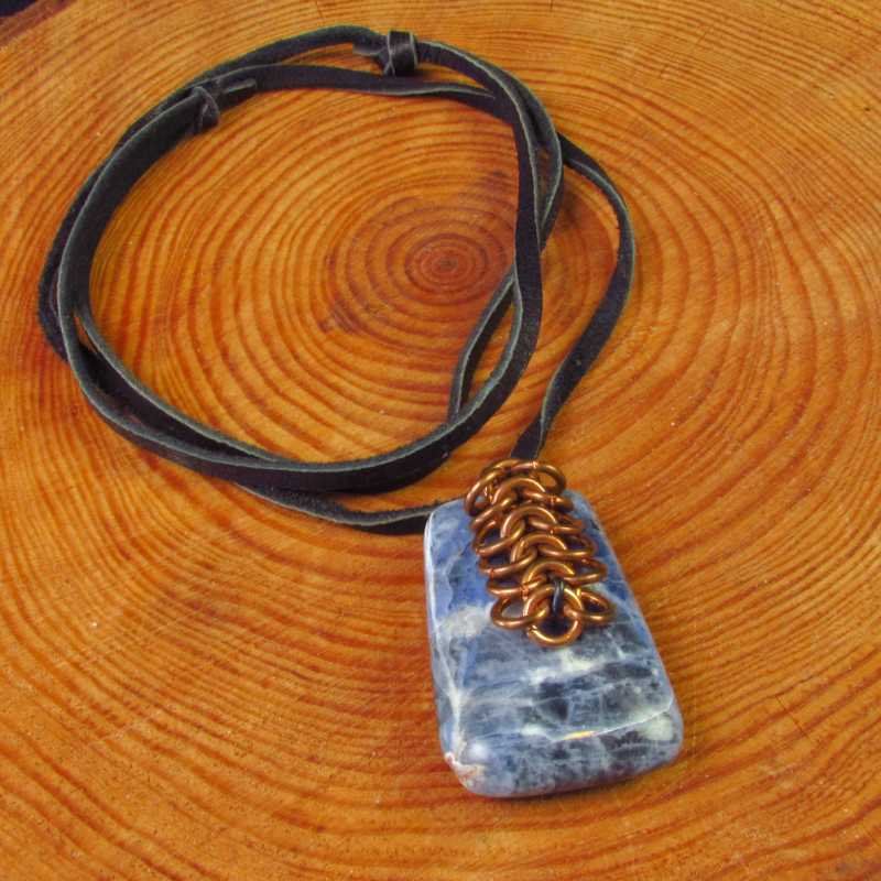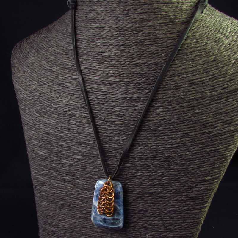 De ketting is opgebouwd uit een gevlekte blauwe steen en koperen ringen in een Europees 4 in 1 weefsel. Hij wordt geleverd met een verstelbaar leren koord, met een maximale lengte van 46 cm.