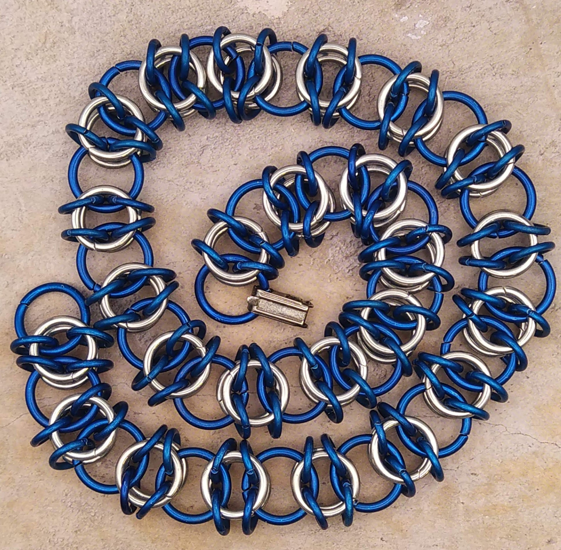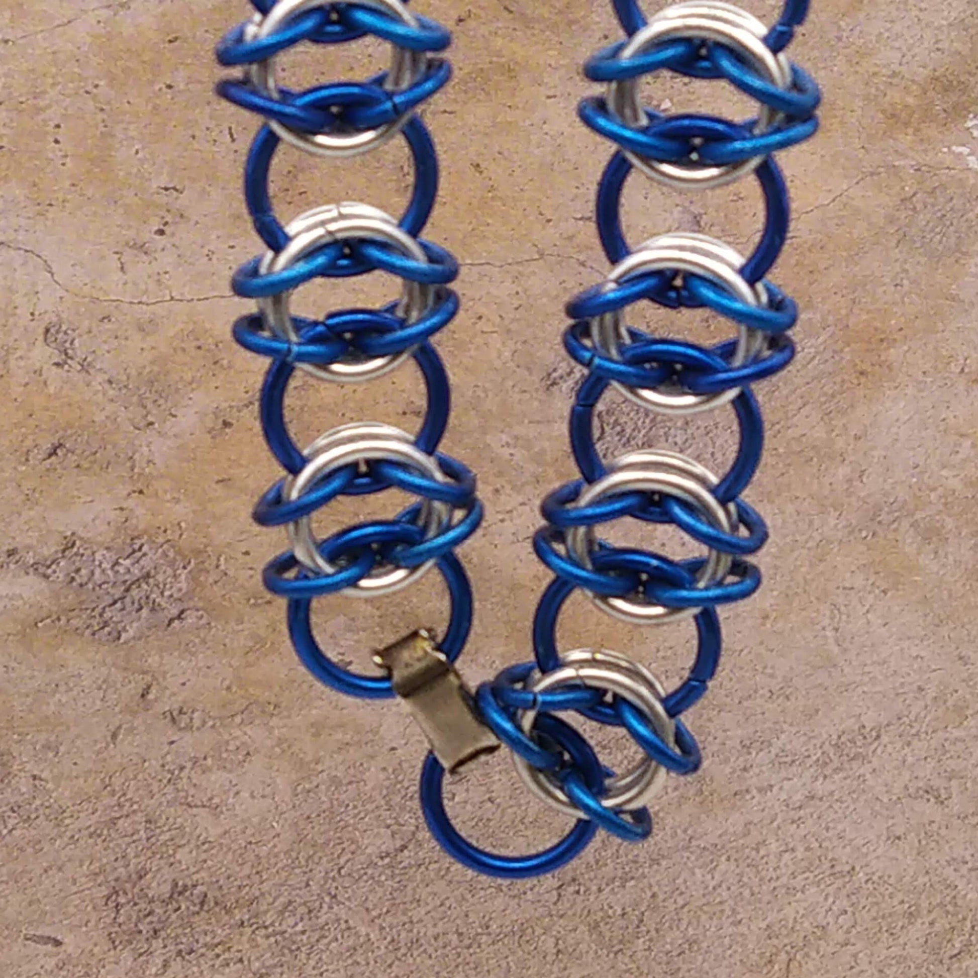 Een met aluminium gemaakte halsketting in zilver en blauw.