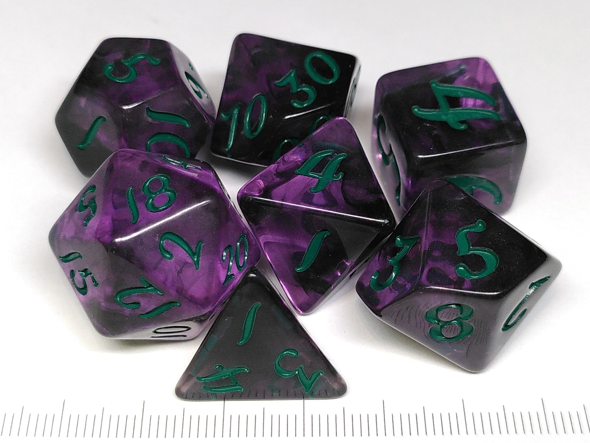 A polydice set of purple transparent resin, featuring green numbers in an elegant script.