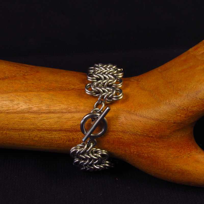 Een armband gemaakt van roestvrij staal, in een creatief gebruikt Perzisch weefsel.